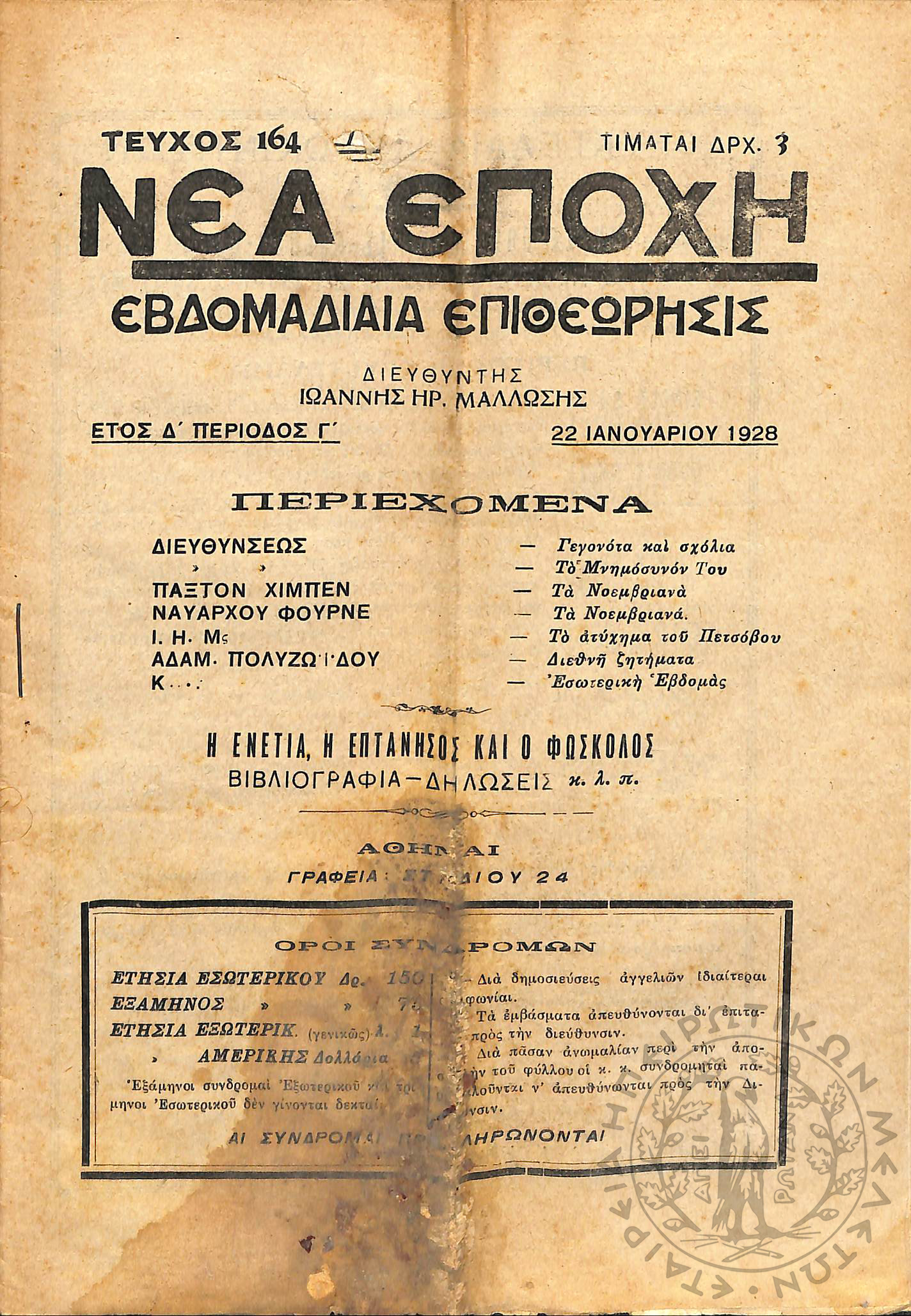 Νέα εποχή: εβδομαδιαία επιθεώρησις πολιτική, οικονομολογική, επιστημονική (τεύχ. 164)Έτος Δ', τεύχ. 164...