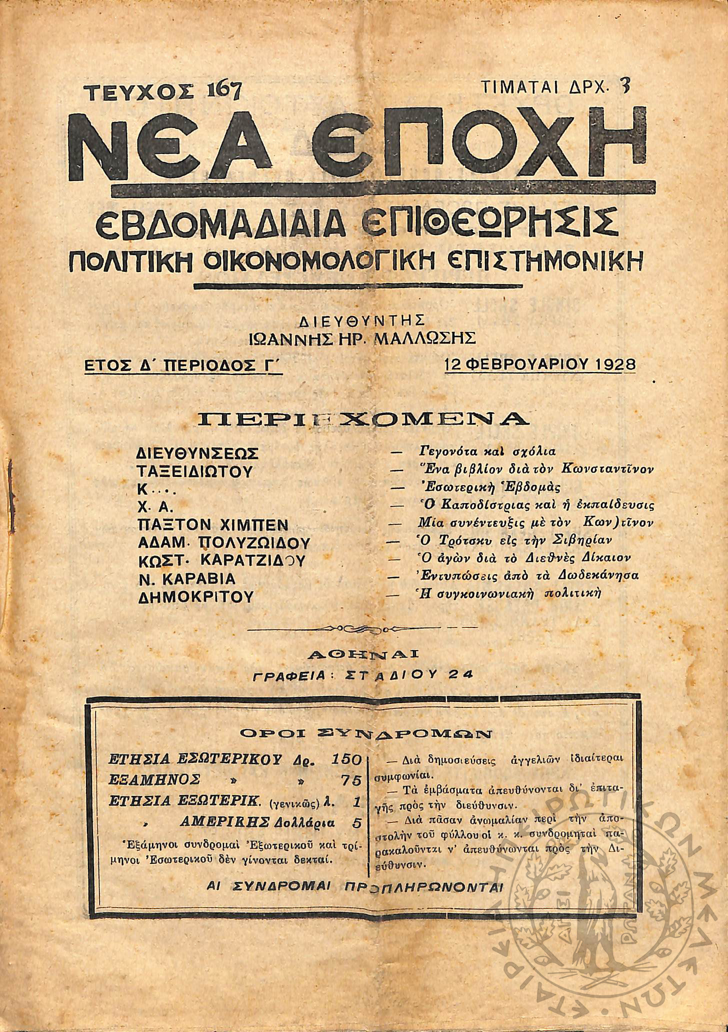 Νέα εποχή: εβδομαδιαία επιθεώρησις πολιτική, οικονομολογική, επιστημονική (τεύχ. 167)Έτος Δ΄, τεύχ. 167...