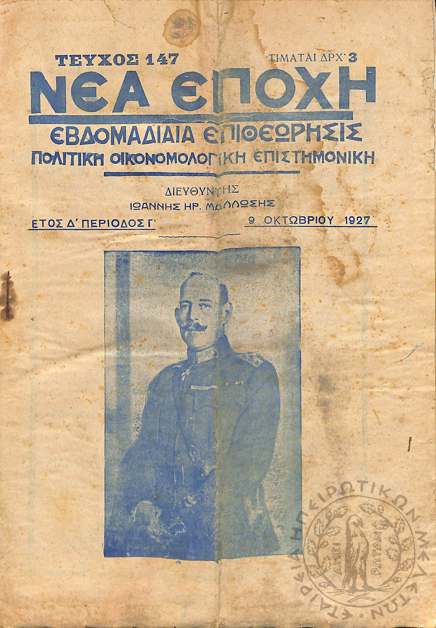 Νέα εποχή: εβδομαδιαία επιθεώρησις πολιτική, οικονομολογική, επιστημονική (τεύχ. 147)Έτος Δ΄, τεύχ. 147...