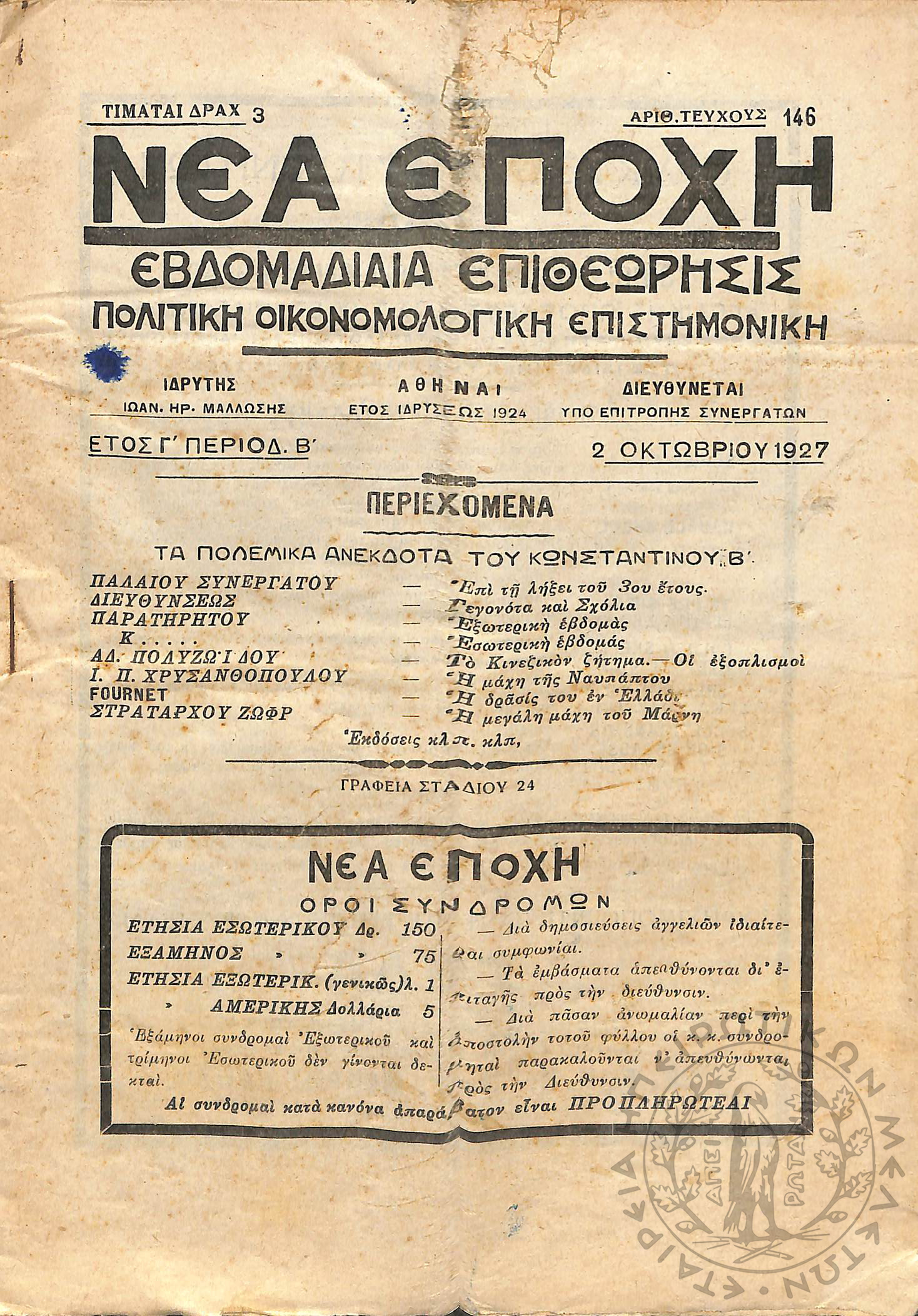 Νέα εποχή: εβδομαδιαία επιθεώρησις πολιτική, οικονομολογική, επιστημονική (τεύχ. 146)Έτος Γ΄, τεύχ. 146...