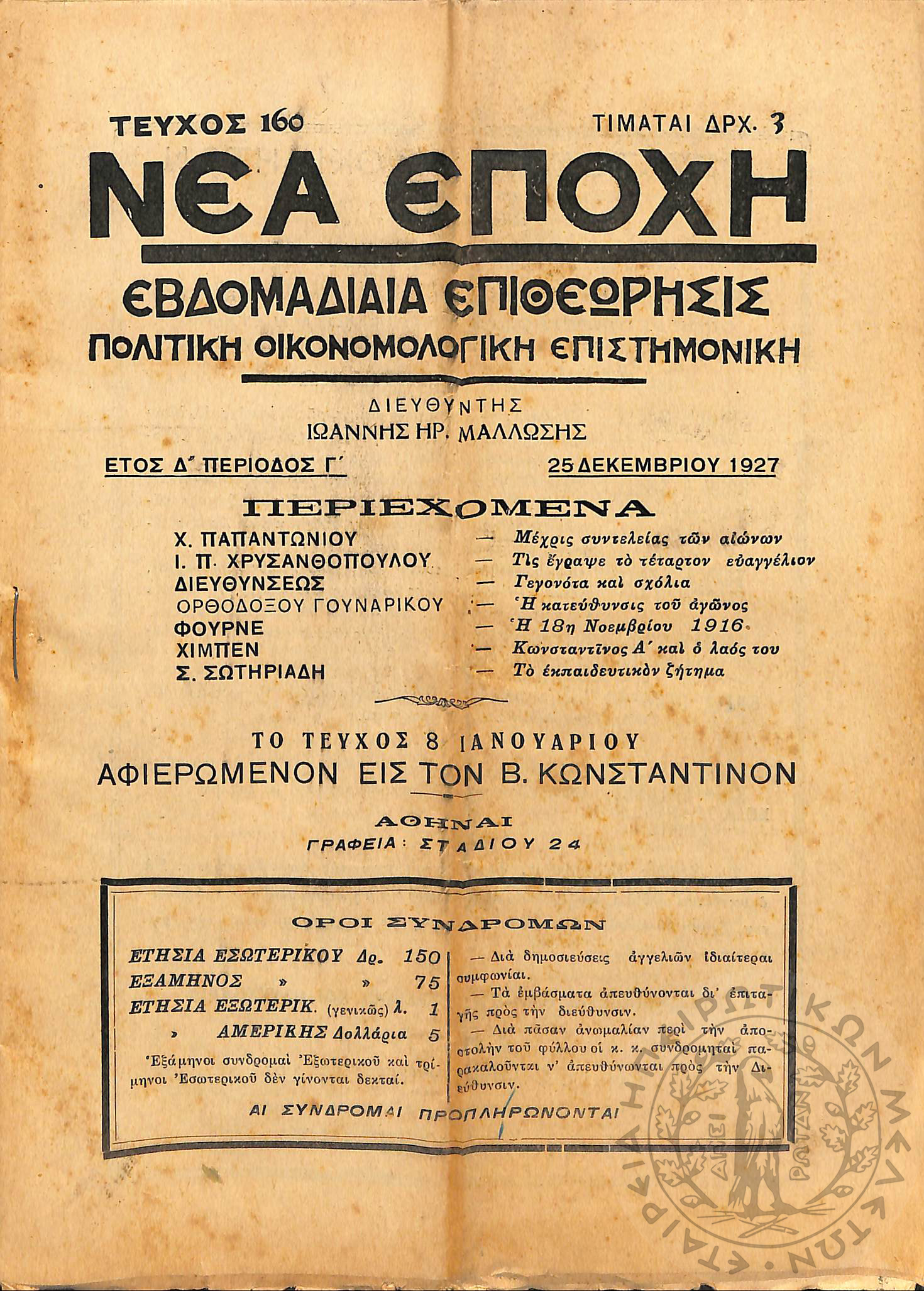 Νέα εποχή: εβδομαδιαία επιθεώρησις πολιτική, οικονομολογική, επιστημονική (τεύχ. 160)Έτος Δ΄, τεύχ. 160...