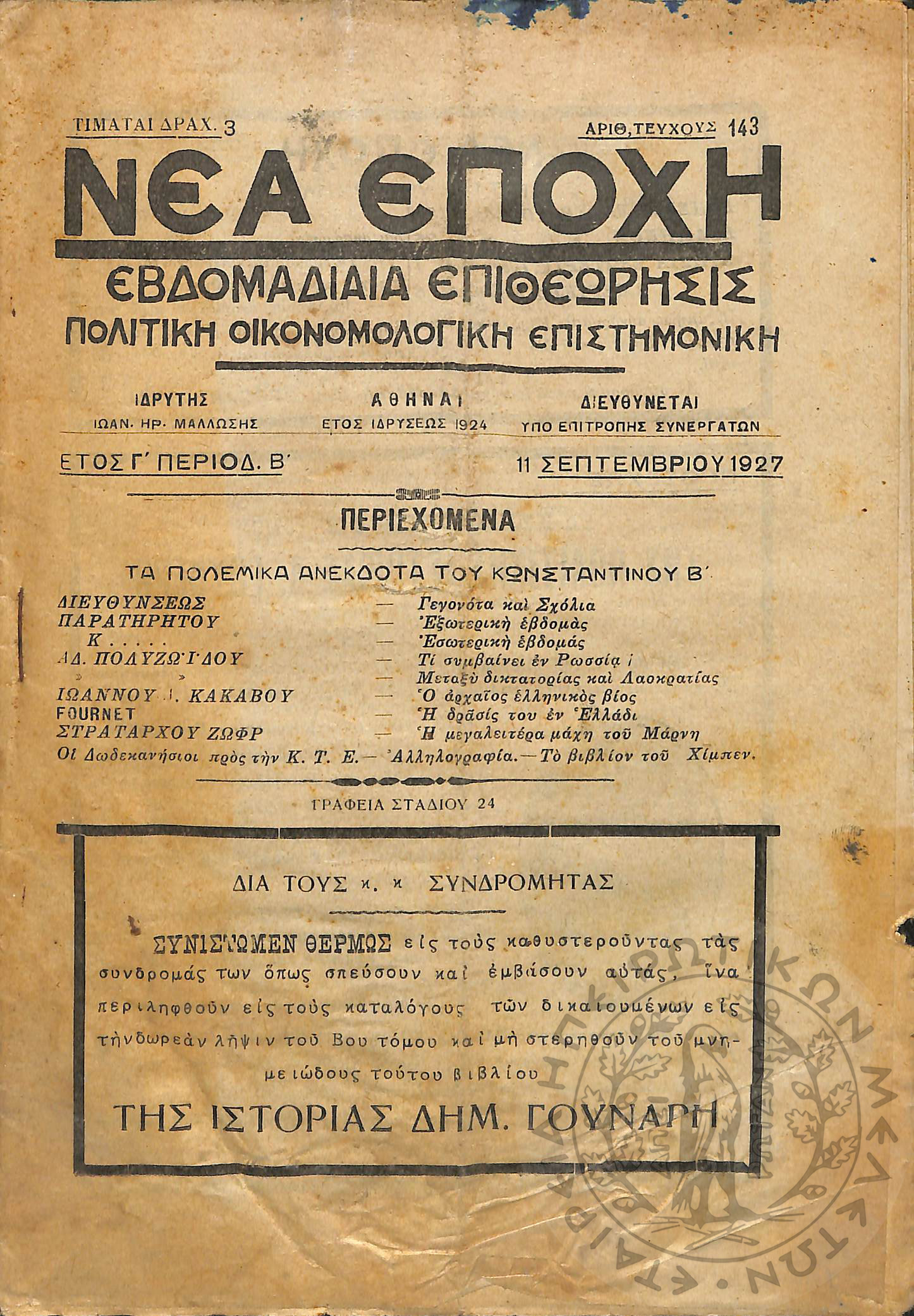 Νέα εποχή: εβδομαδιαία επιθεώρησις πολιτική, οικονομολογική, επιστημονική (τεύχ. 143)Έτος Γ΄, τεύχ. 143...
