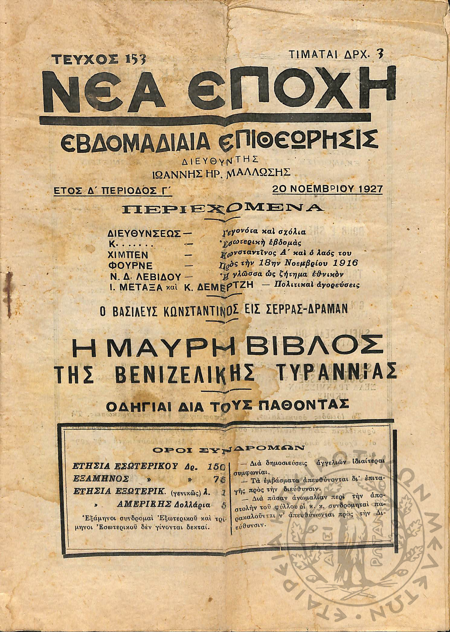 Νέα εποχή: εβδομαδιαία επιθεώρησις πολιτική, οικονομολογική, επιστημονική (τεύχ. 153)Έτος Δ΄, τεύχ. 153...