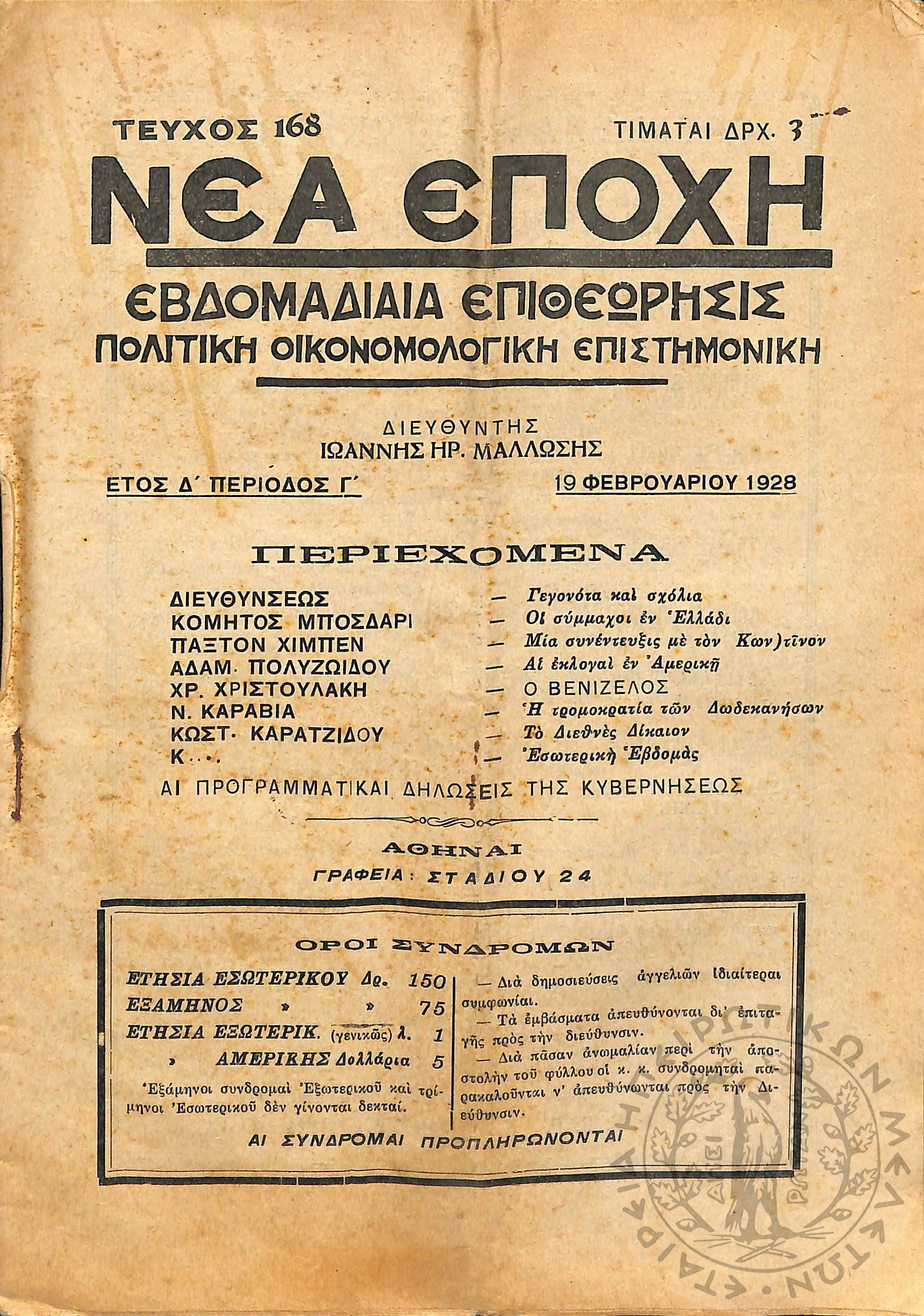 Νέα εποχή: εβδομαδιαία επιθεώρησις πολιτική, οικονομολογική, επιστημονική (τεύχ. 168)Έτος Δ΄, τεύχ. 168...