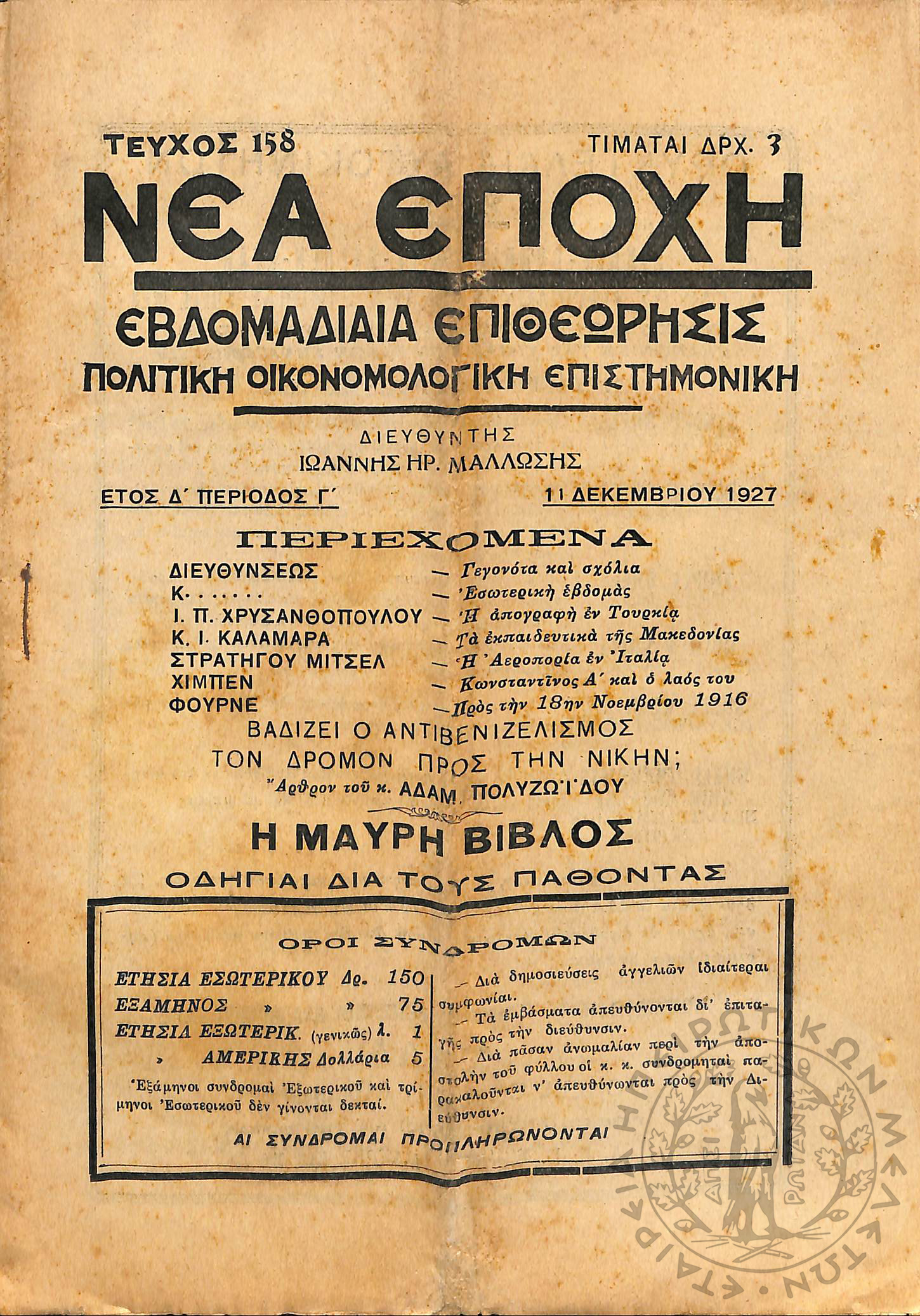 Νέα εποχή: εβδομαδιαία επιθεώρησις πολιτική, οικονομολογική, επιστημονική (τεύχ. 158)Έτος Δ΄, τεύχ. 158...
