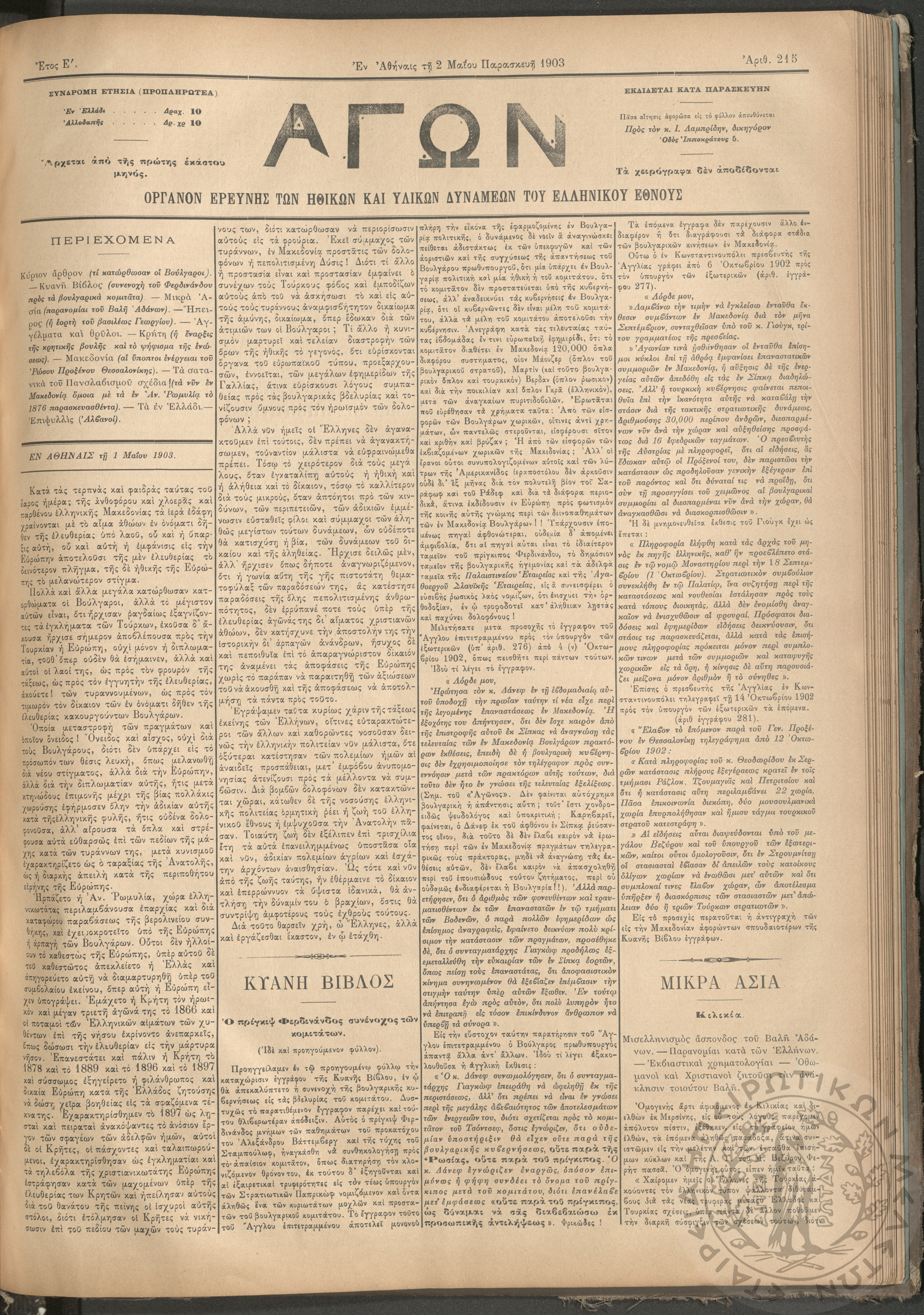 Αγών: Όργανον ερεύνης των ηθικών και υλικών δυνάμεων του Ελληνικού Έθνους, 1903 (Φ. 215)Έτος Ε΄, Φ. 215...