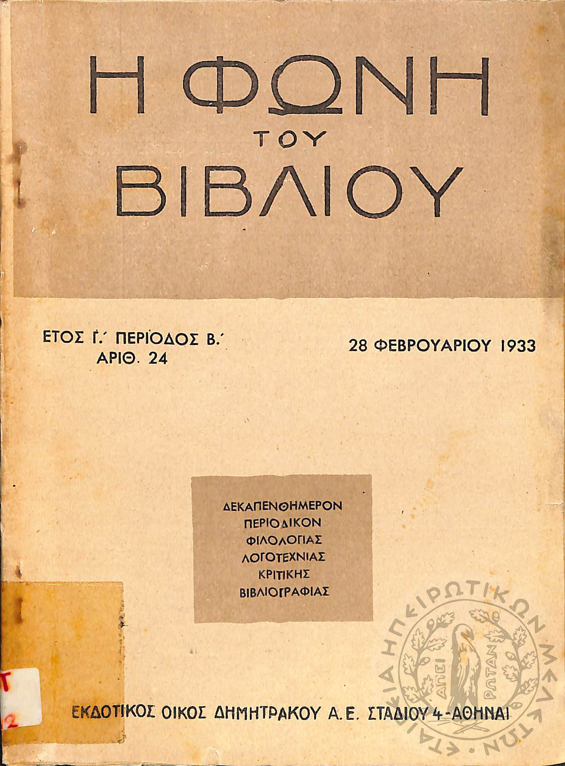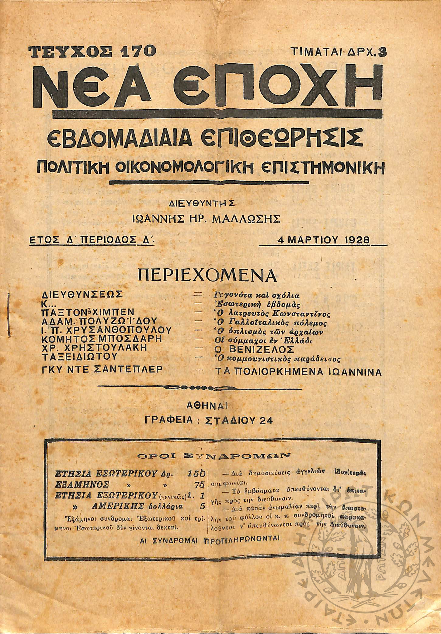 Νέα εποχή: εβδομαδιαία επιθεώρησις πολιτική, οικονομολογική, επιστημονική (τεύχ. 170)Έτος Δ΄, τεύχ. 170...