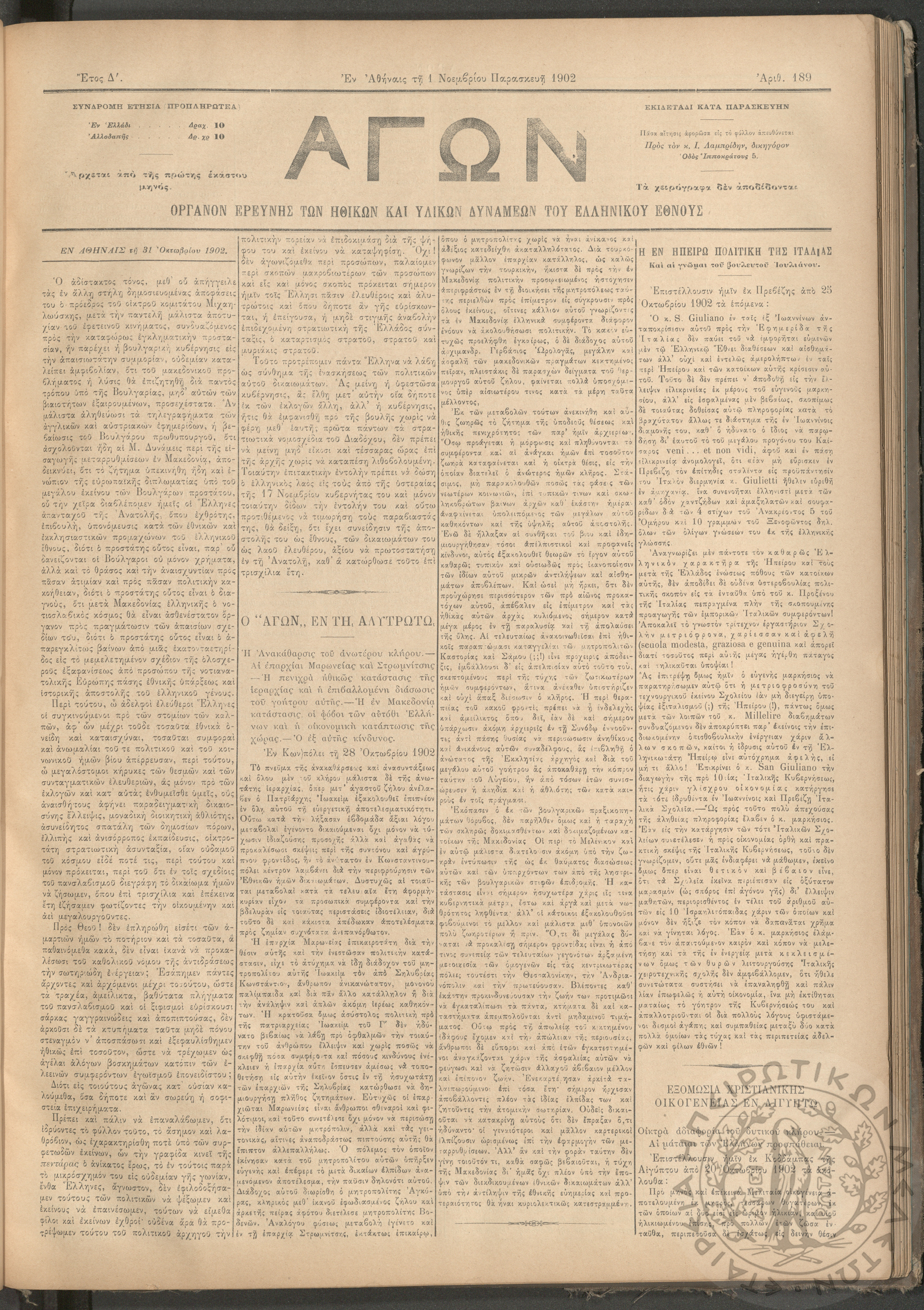 Αγών: Όργανον ερεύνης των ηθικών και υλικών δυνάμεων του Ελληνικού Έθνους, 1902 (Φ. 189)Έτος Δ΄, Φ. 189...