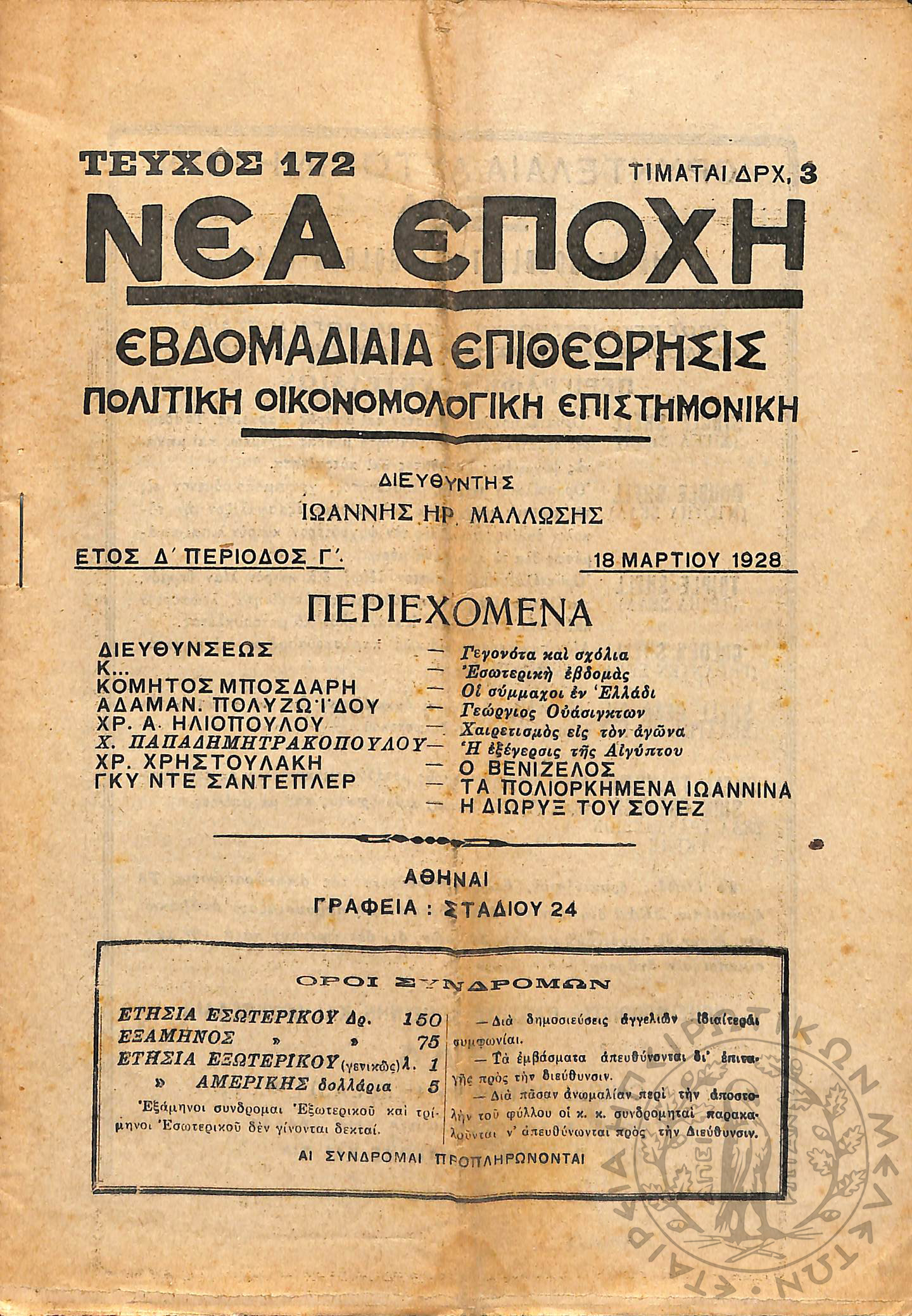 Νέα εποχή: εβδομαδιαία επιθεώρησις πολιτική, οικονομολογική, επιστημονική (τεύχ. 172)Έτος Δ΄, τεύχ. 172...