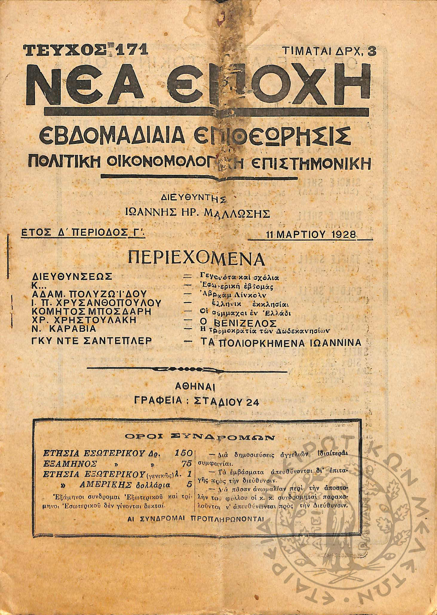 Νέα εποχή: εβδομαδιαία επιθεώρησις πολιτική, οικονομολογική, επιστημονική (τεύχ. 171)Έτος Δ΄, τεύχ. 171...