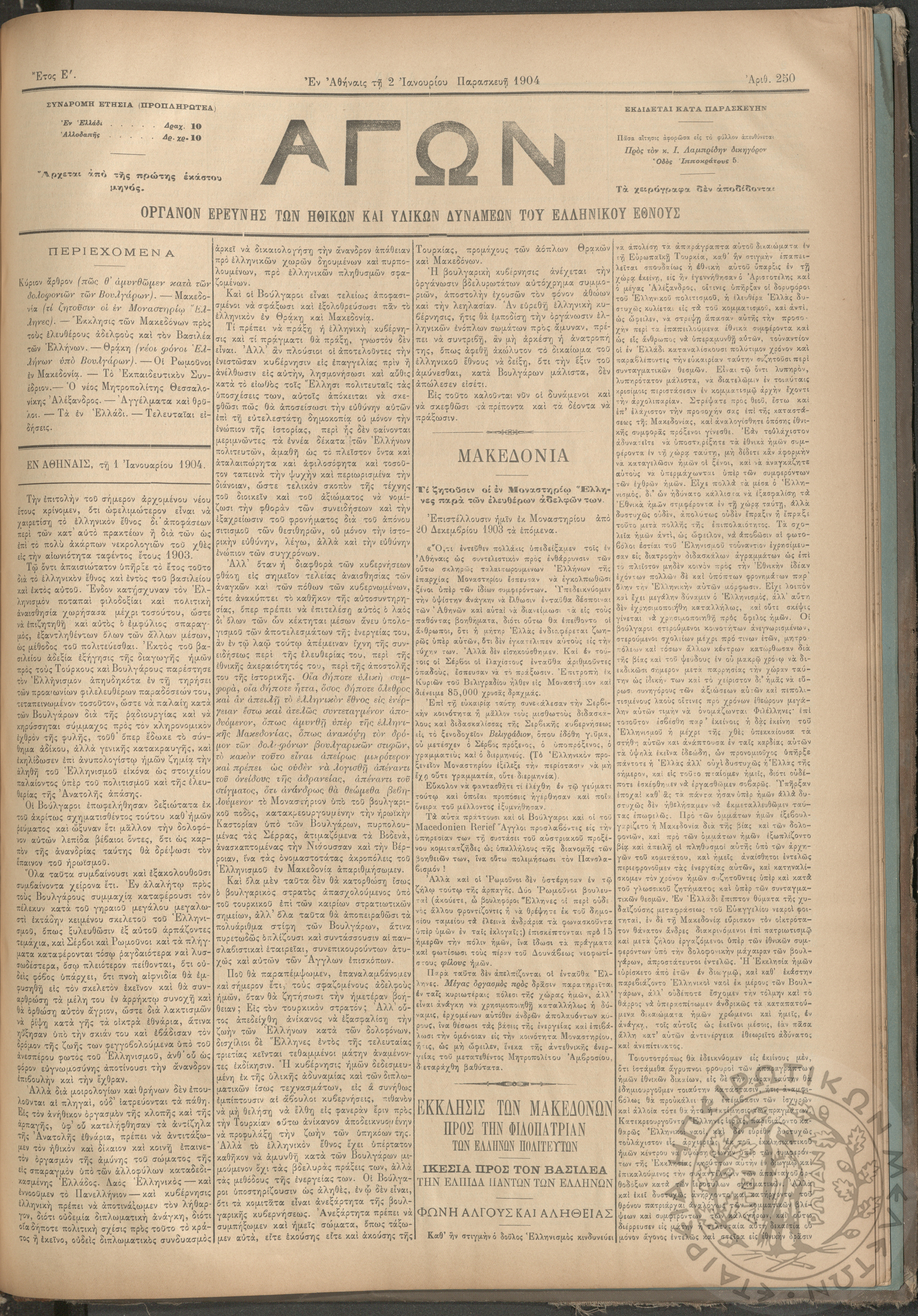 Αγών: Όργανον ερεύνης των ηθικών και υλικών δυνάμεων του Ελληνικού Έθνους, 1904 (Φ. 250)Έτος Ε΄, Φ. 250...