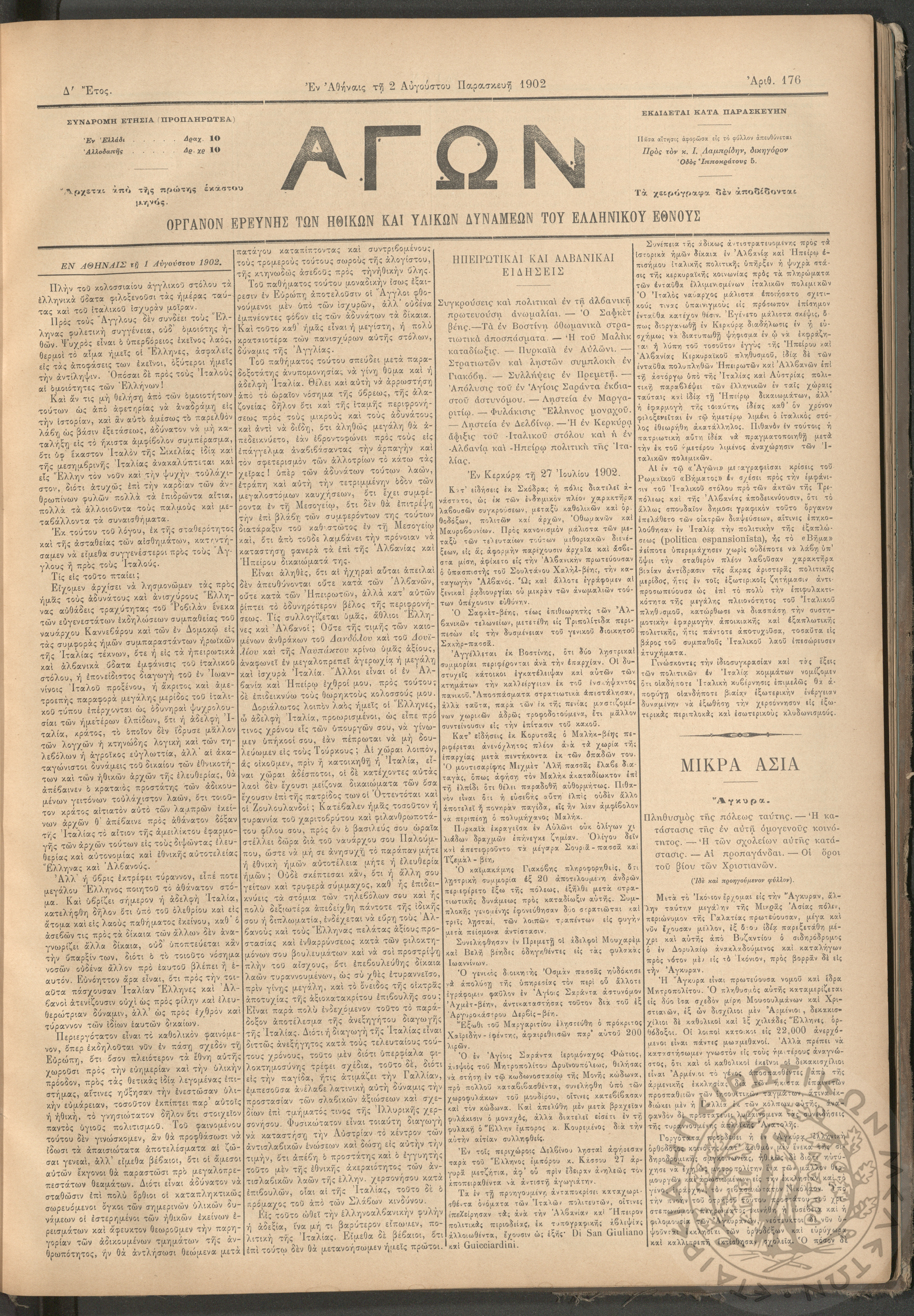 Αγών: Όργανον ερεύνης των ηθικών και υλικών δυνάμεων του Ελληνικού Έθνους, 1902 (Φ. 176)Έτος Δ΄, Φ. 176...