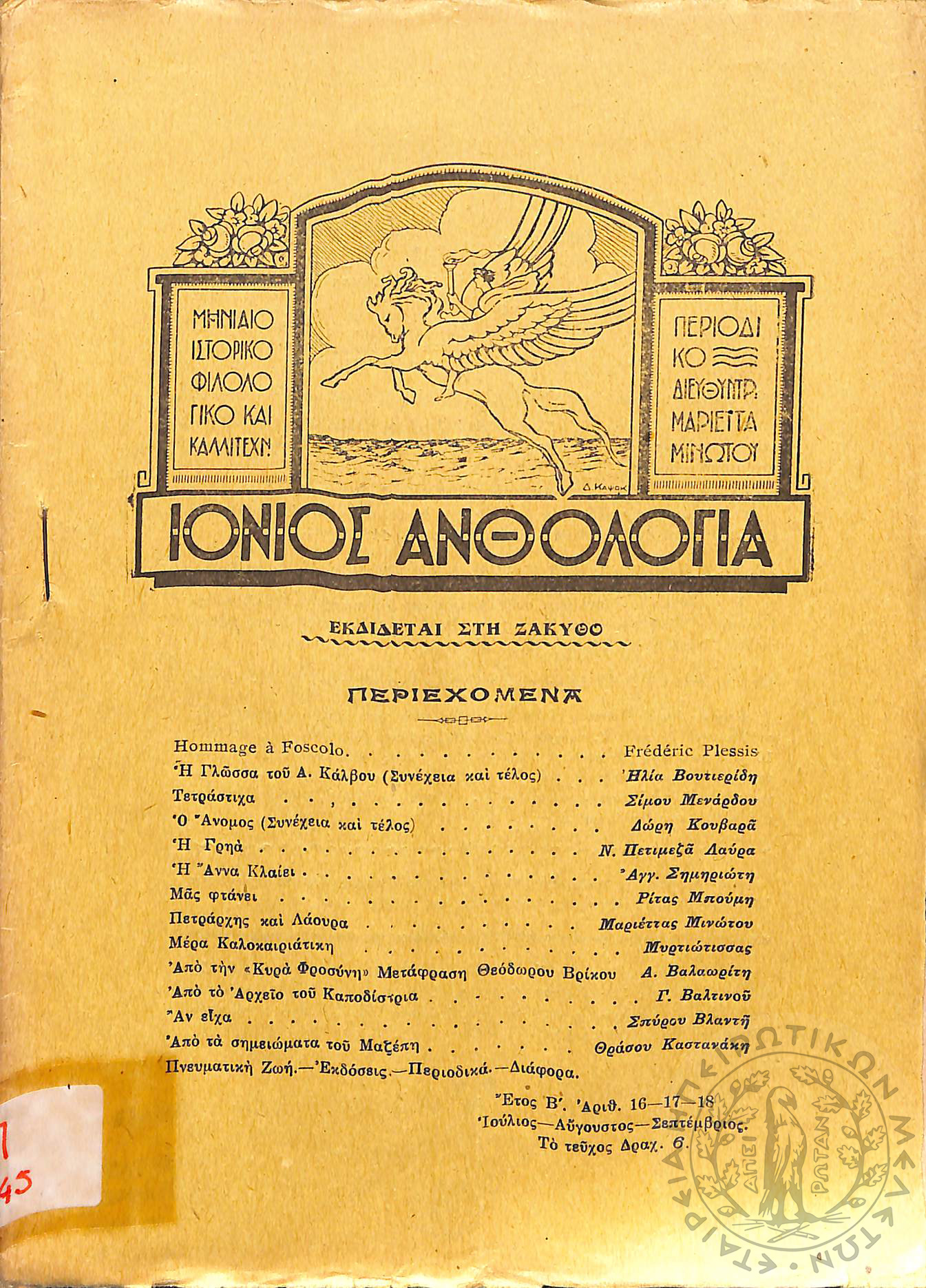 Ιόνιος Ανθολογία: μηνιαίο ιστορικό, φιλολογικό και καλλιτεχνικό περιοδικό (τεύχ. 16-18)Έτος Β', τεύχ. 16-18...