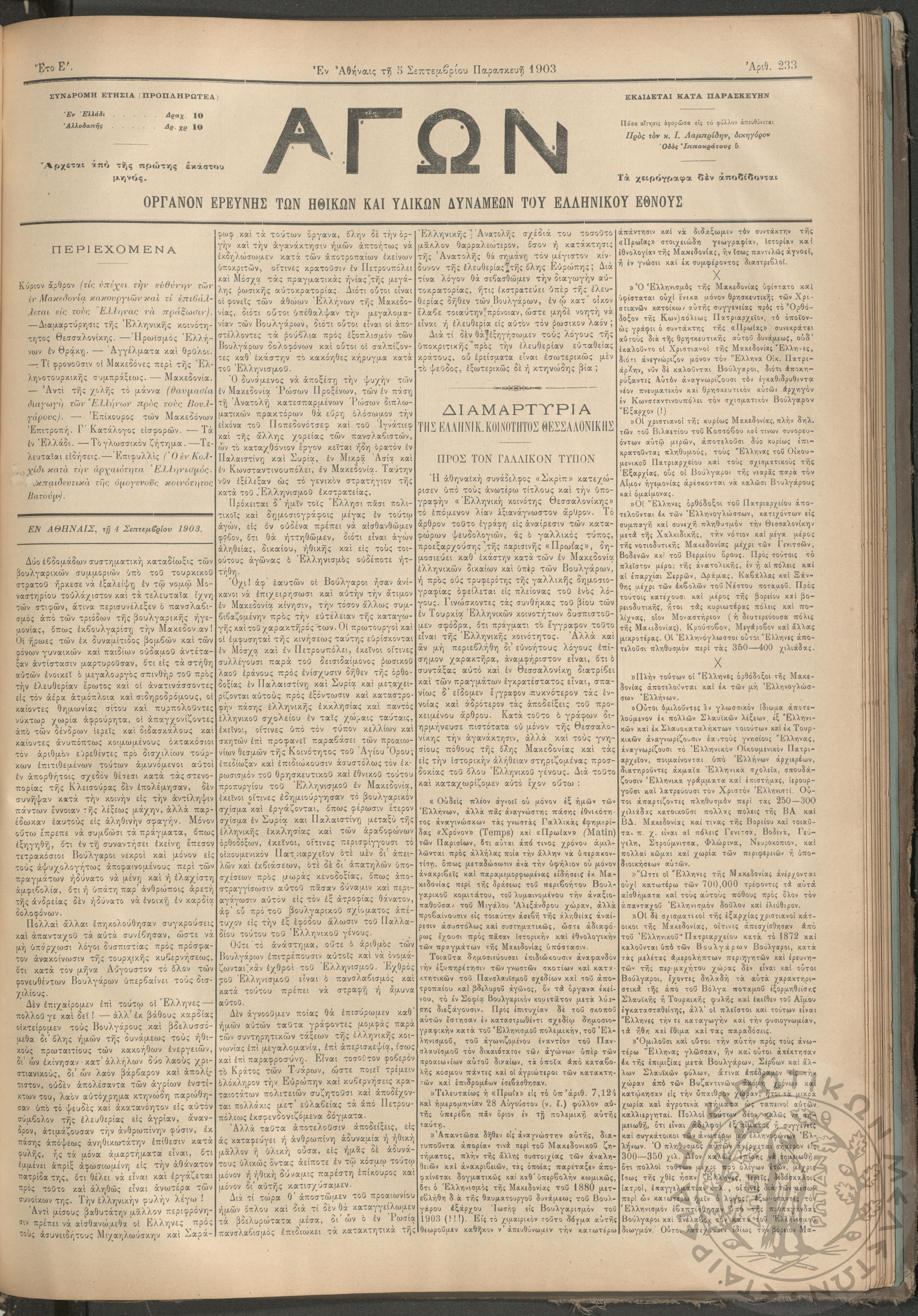 Αγών: Όργανον ερεύνης των ηθικών και υλικών δυνάμεων του Ελληνικού Έθνους, 1903 (Φ. 233)Έτος Ε΄, Φ. 233...