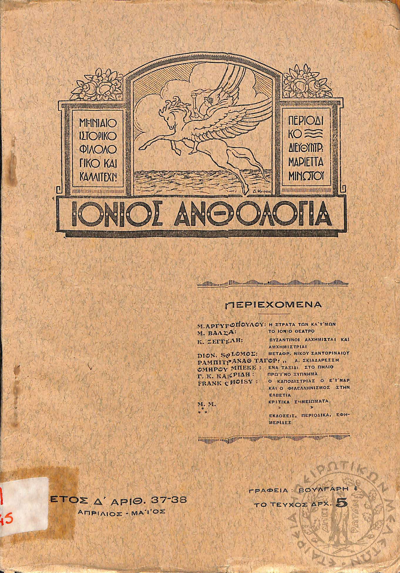 Ιόνιος Ανθολογία: μηνιαίο ιστορικό, φιλολογικό και καλλιτεχνικό περιοδικό (τεύχ. 37-38)Έτος Δ', τεύχ. 37-38...