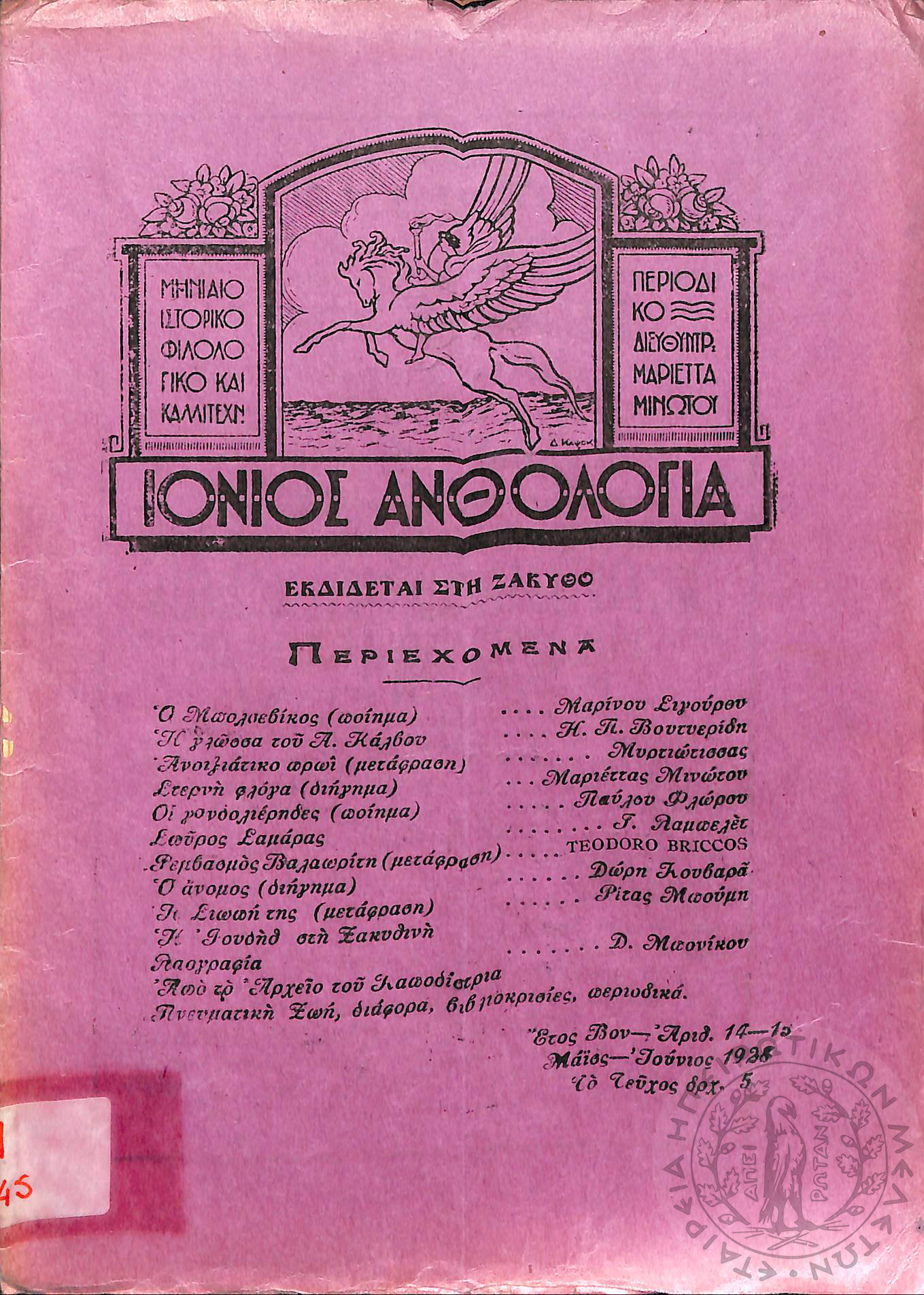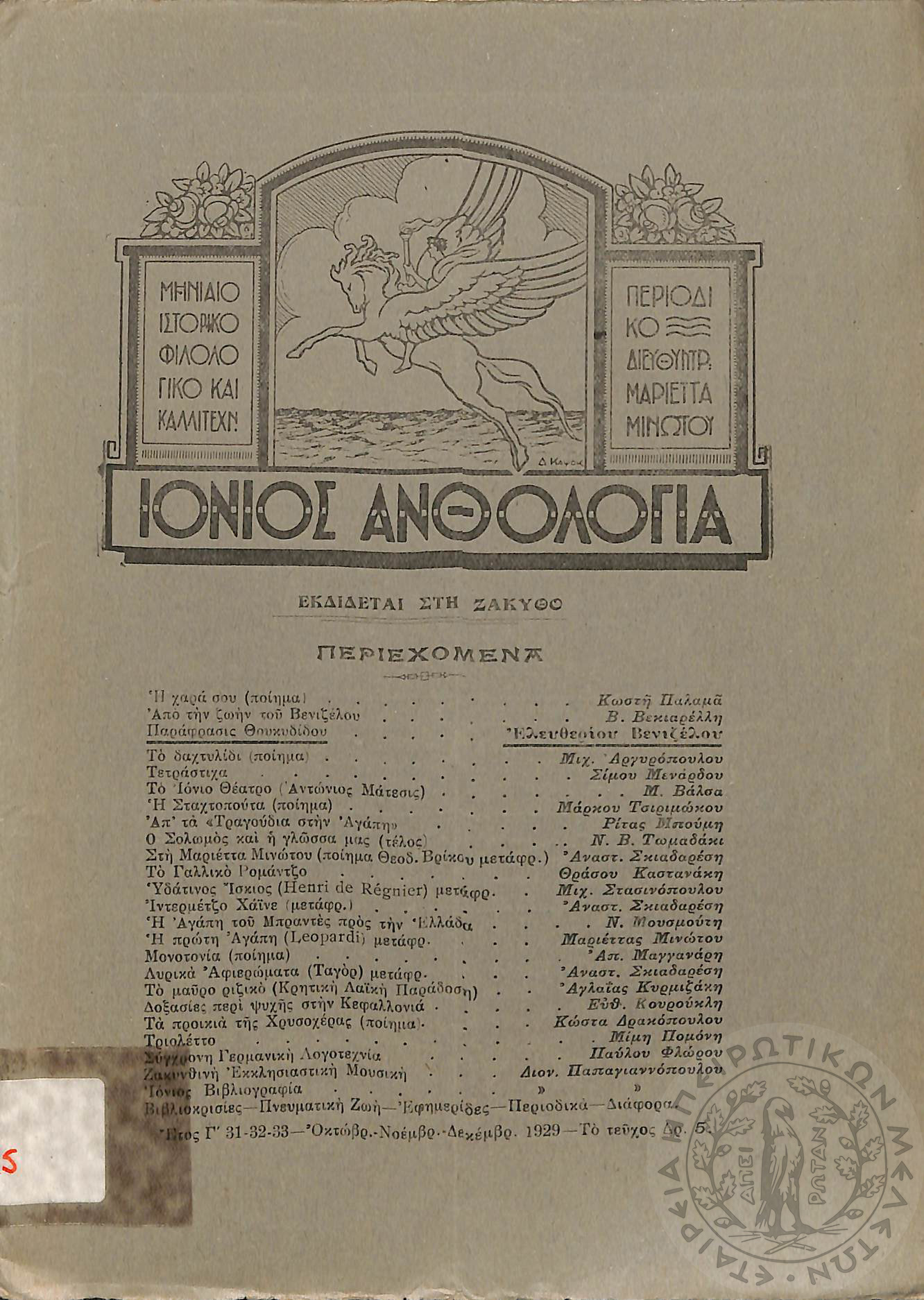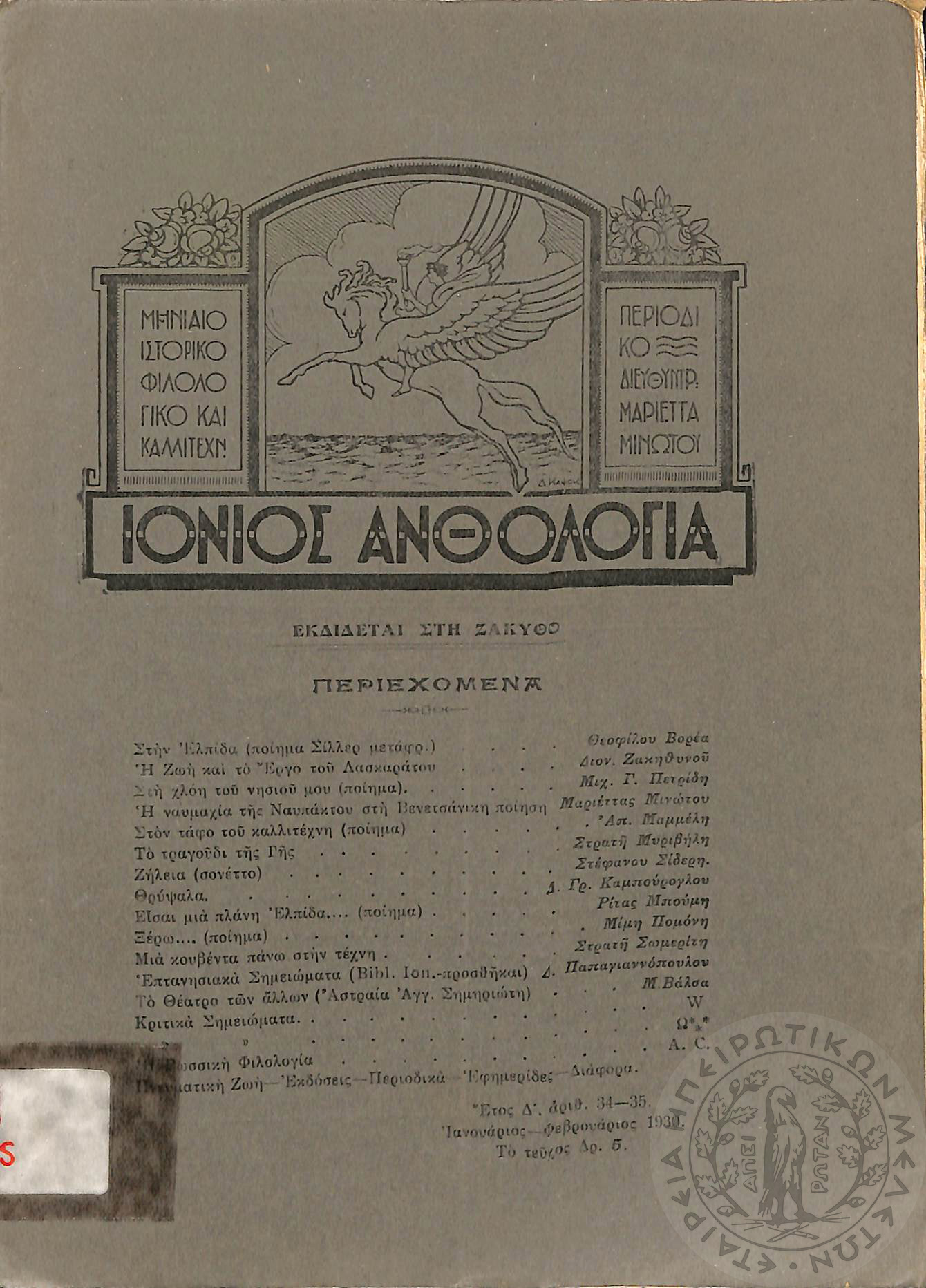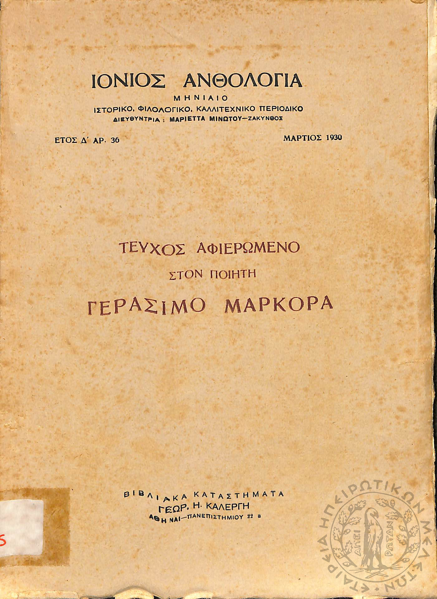 Ιόνιος Ανθολογία: μηνιαίο ιστορικό, φιλολογικό και καλλιτεχνικό περιοδικό (τεύχ. 36) [Τεύχος αφιερωμένο στον ποιητή Γεράσιμο Μαρκορά]Έτος Δ', τεύχ. 36...