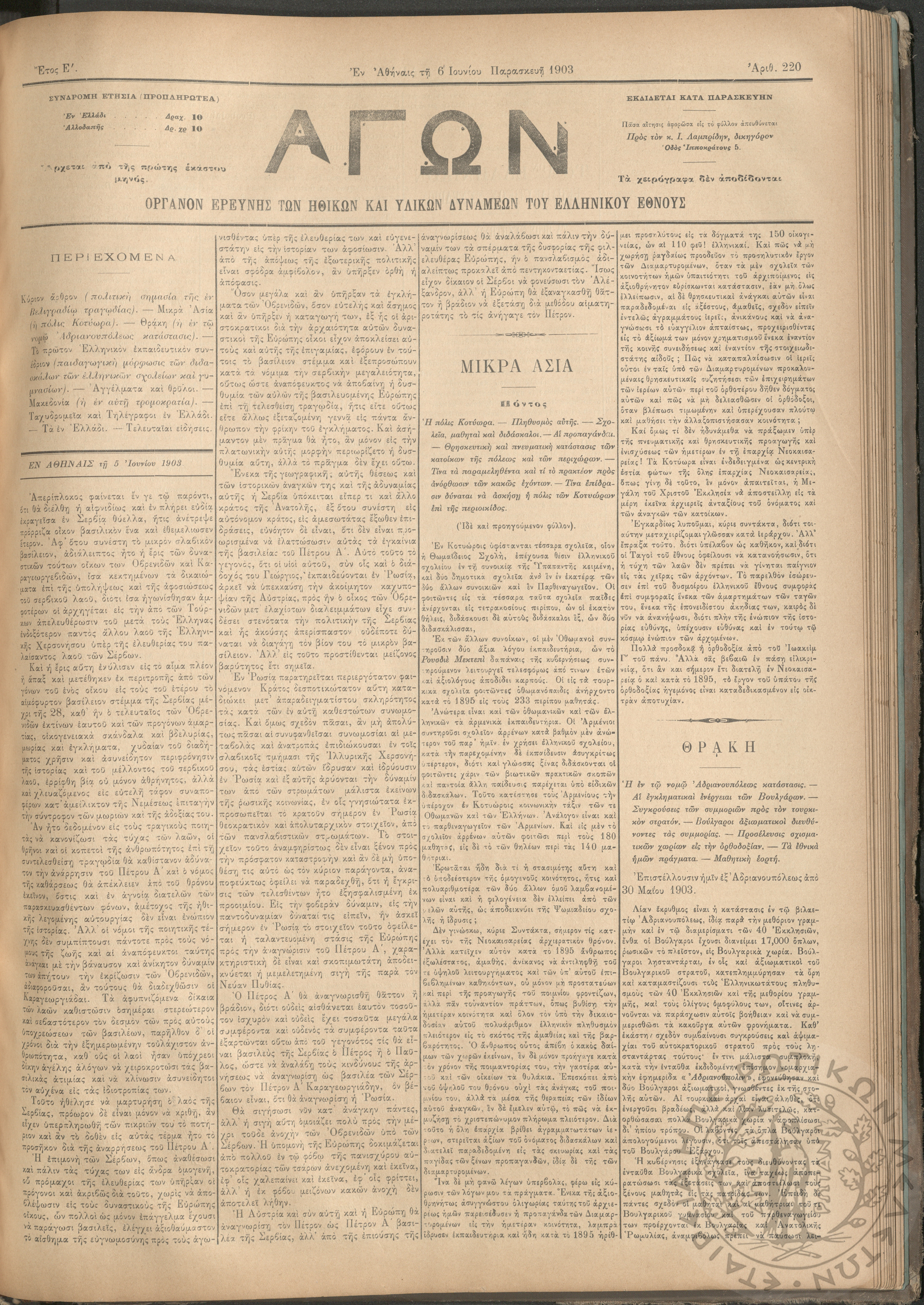 Αγών: Όργανον ερεύνης των ηθικών και υλικών δυνάμεων του Ελληνικού Έθνους, 1903 (Φ. 220)Έτος Ε΄, Φ. 220...