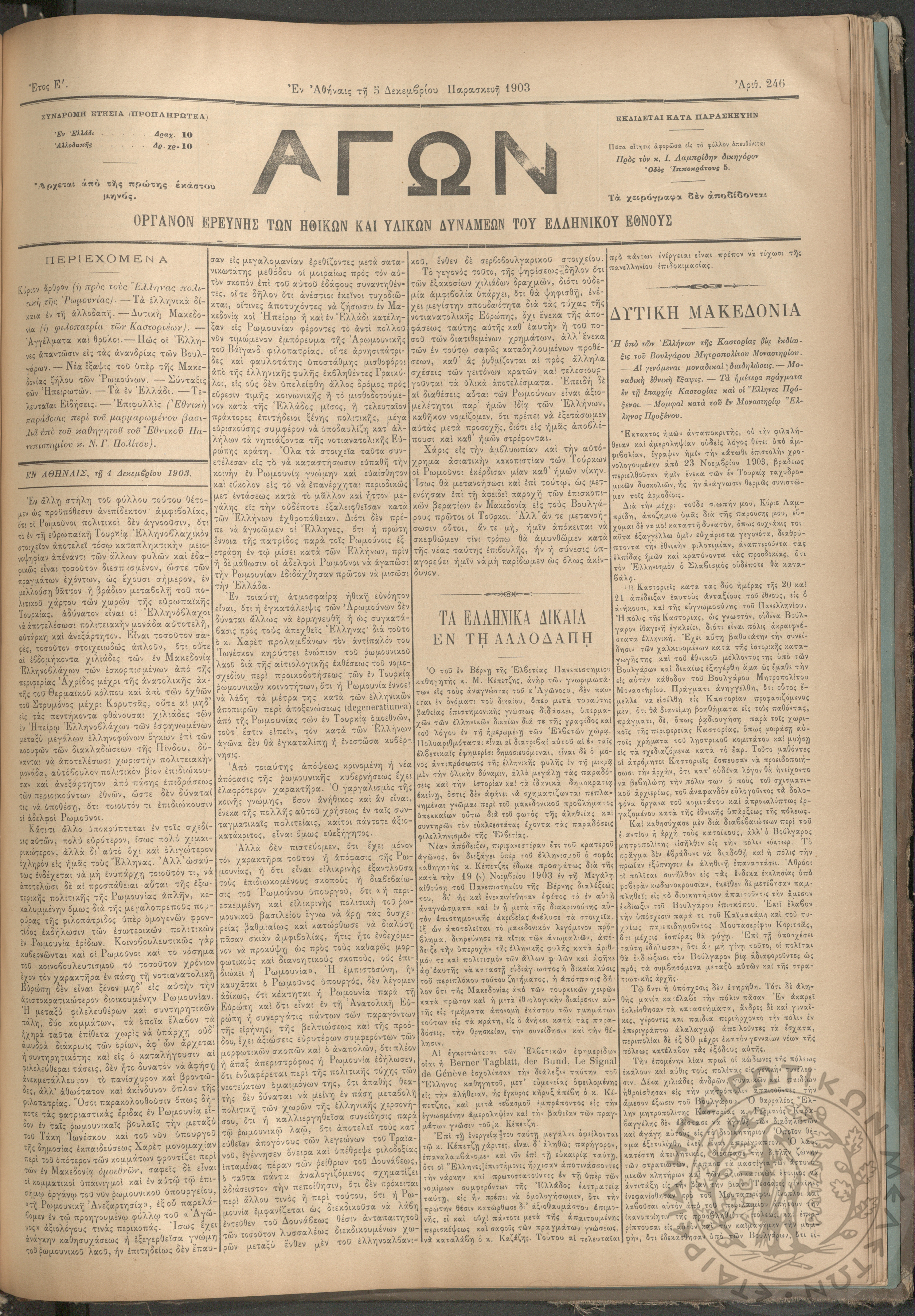 Αγών: Όργανον ερεύνης των ηθικών και υλικών δυνάμεων του Ελληνικού Έθνους, 1903 (Φ. 246)Έτος Ε΄, Φ. 246...