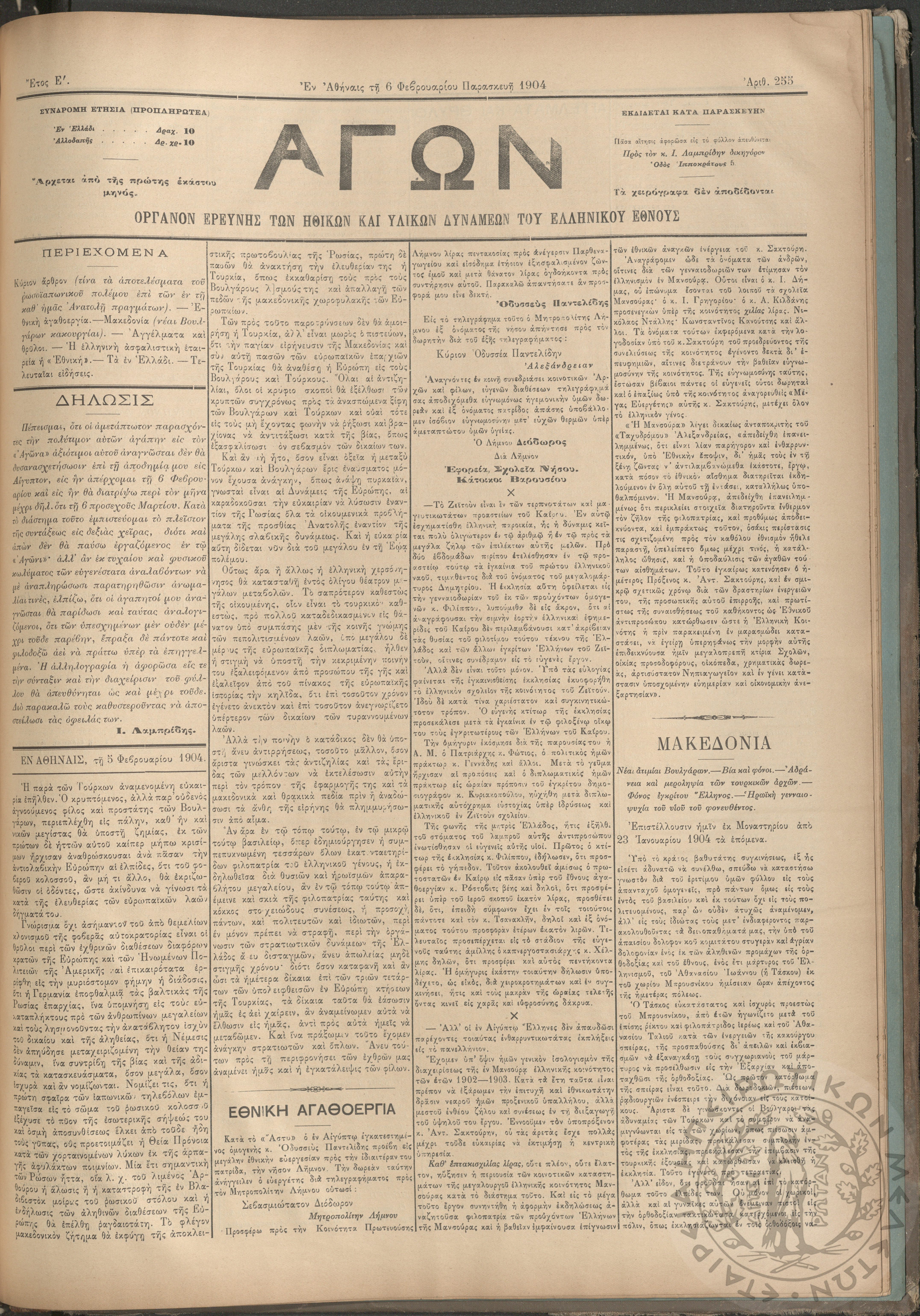 Αγών: Όργανον ερεύνης των ηθικών και υλικών δυνάμεων του Ελληνικού Έθνους, 1904 (Φ. 255)Έτος Ε΄, Φ. 255...