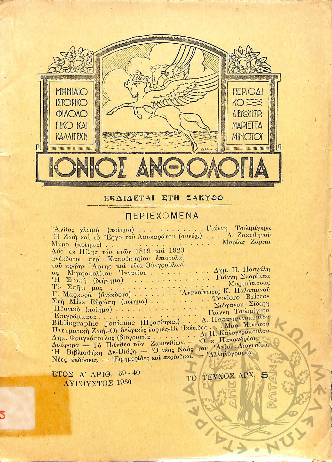 Ιόνιος Ανθολογία: μηνιαίο ιστορικό, φιλολογικό και καλλιτεχνικό περιοδικό (τεύχ. 39-40)Έτος Δ', τεύχ. 39-40...