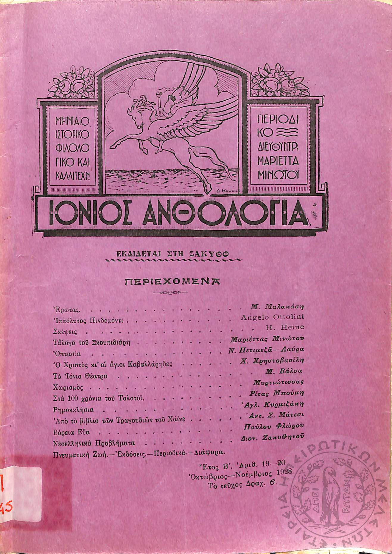 Ιόνιος Ανθολογία: μηνιαίο ιστορικό, φιλολογικό και καλλιτεχνικό περιοδικό (τεύχ. 19-20)Έτος Β', τεύχ. 19-20...