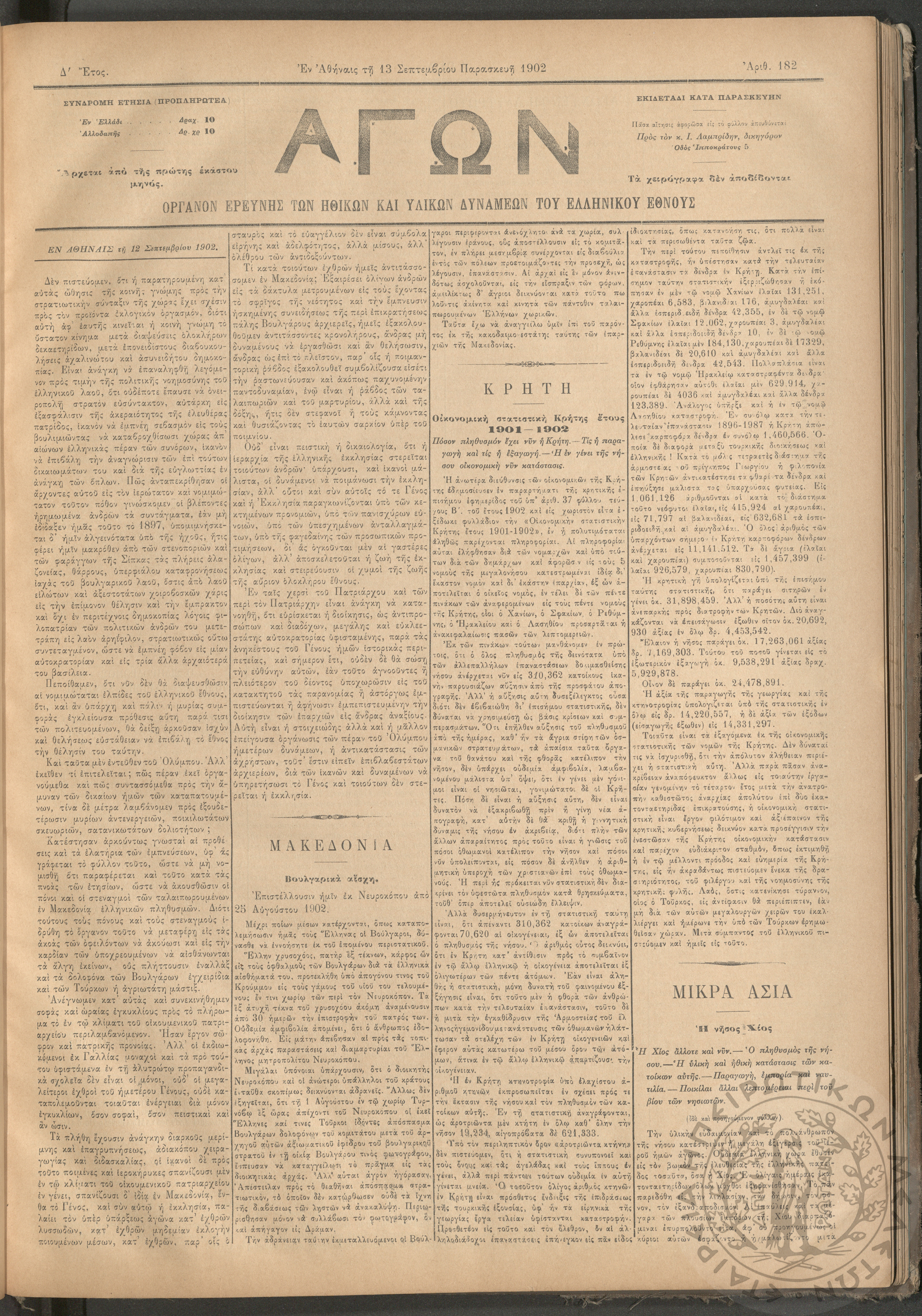 Αγών: Όργανον ερεύνης των ηθικών και υλικών δυνάμεων του Ελληνικού Έθνους, 1902 (Φ. 182)Έτος Δ΄, Φ. 182...