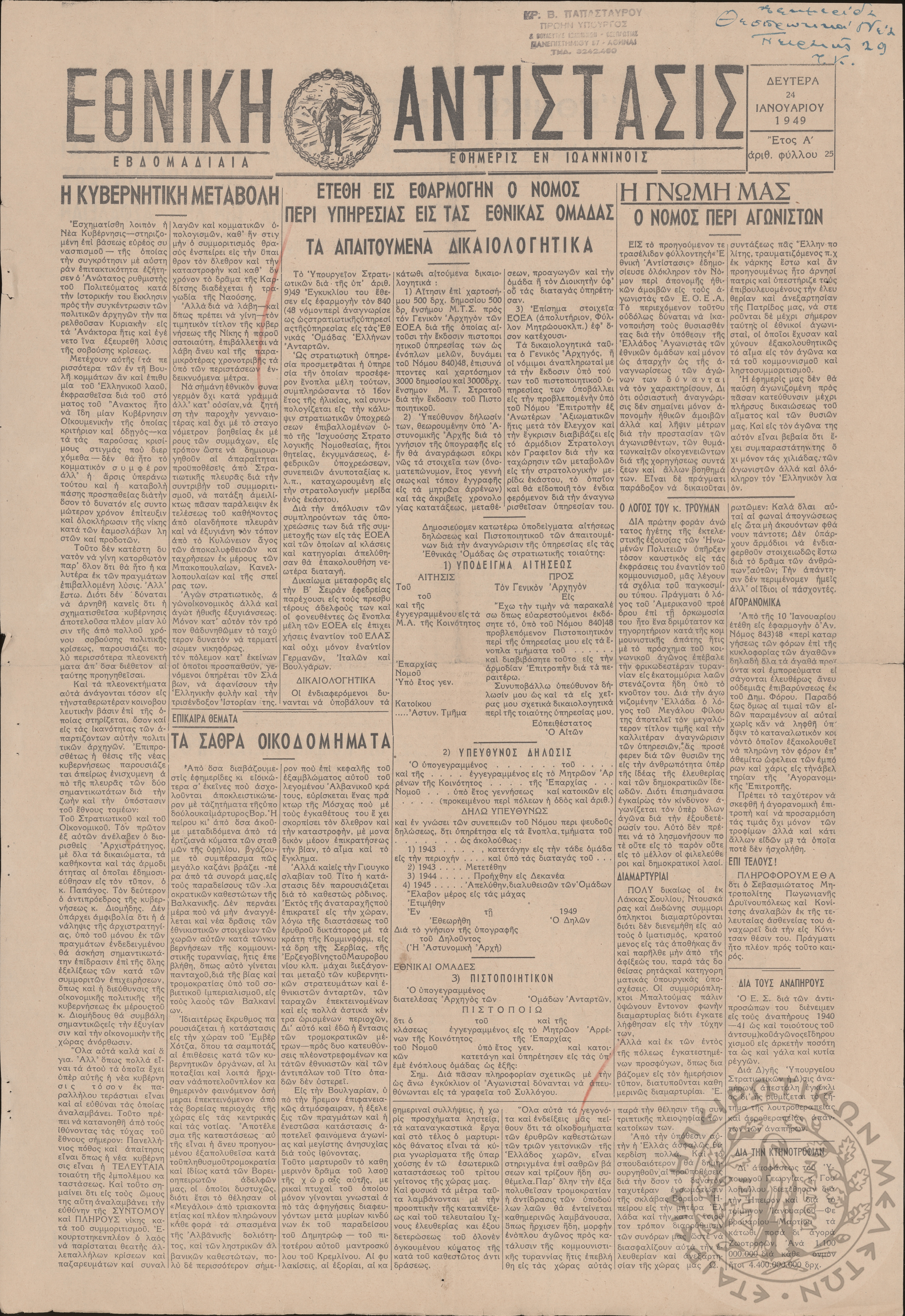 Εθνική Αντίστασις: εβδομαδιαία πρωϊνή εφημερίς εν Ιωαννίνοις: όργανον των αγωνιστών της Εθνικής Αντιστάσεως (Ε.Ο.Ε.Α.), 1949, φ. 25Έτος Α', φ. 25...