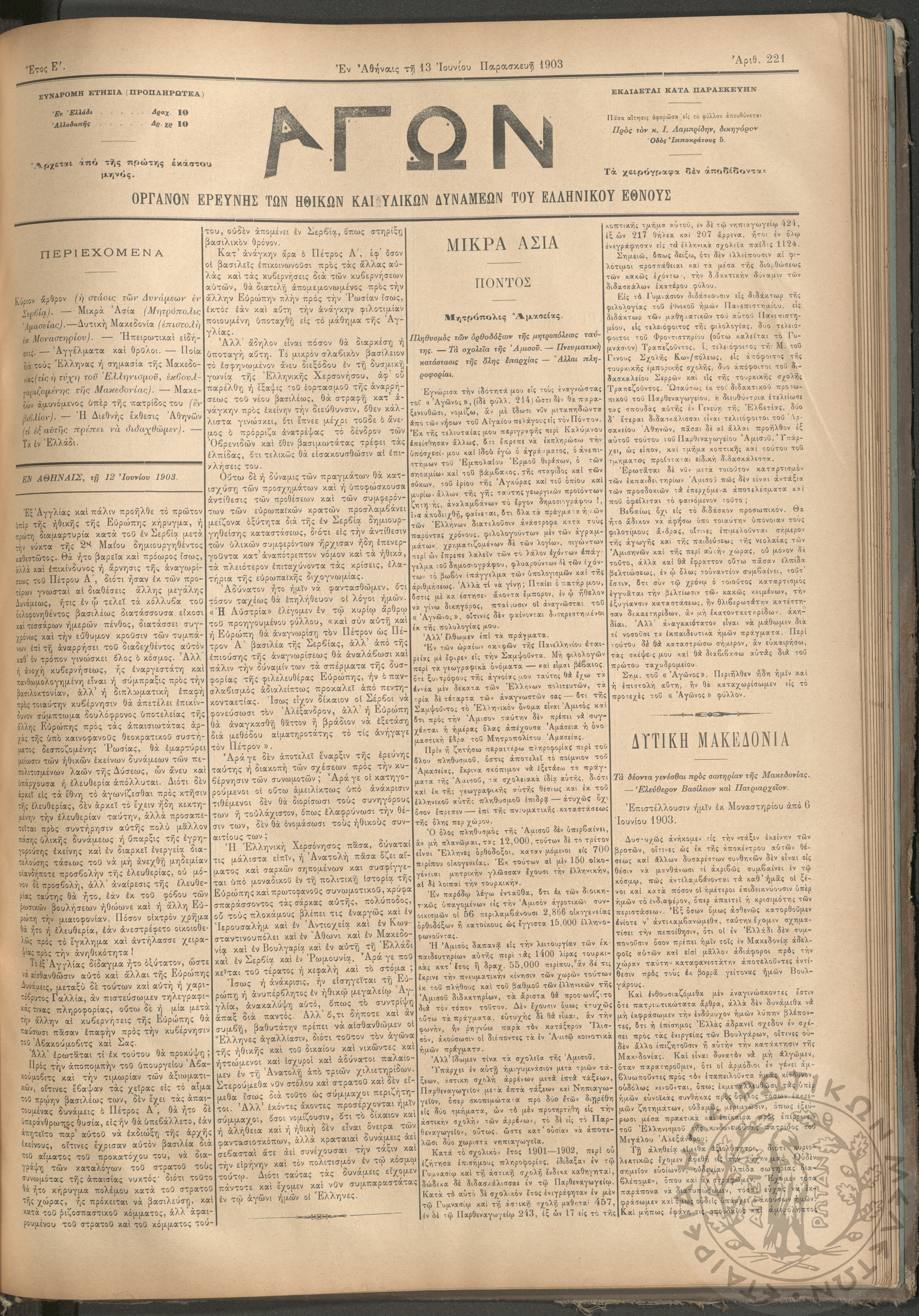 Αγών: Όργανον ερεύνης των ηθικών και υλικών δυνάμεων του Ελληνικού Έθνους, 1903 (Φ. 221)Έτος Ε΄, Φ. 221...