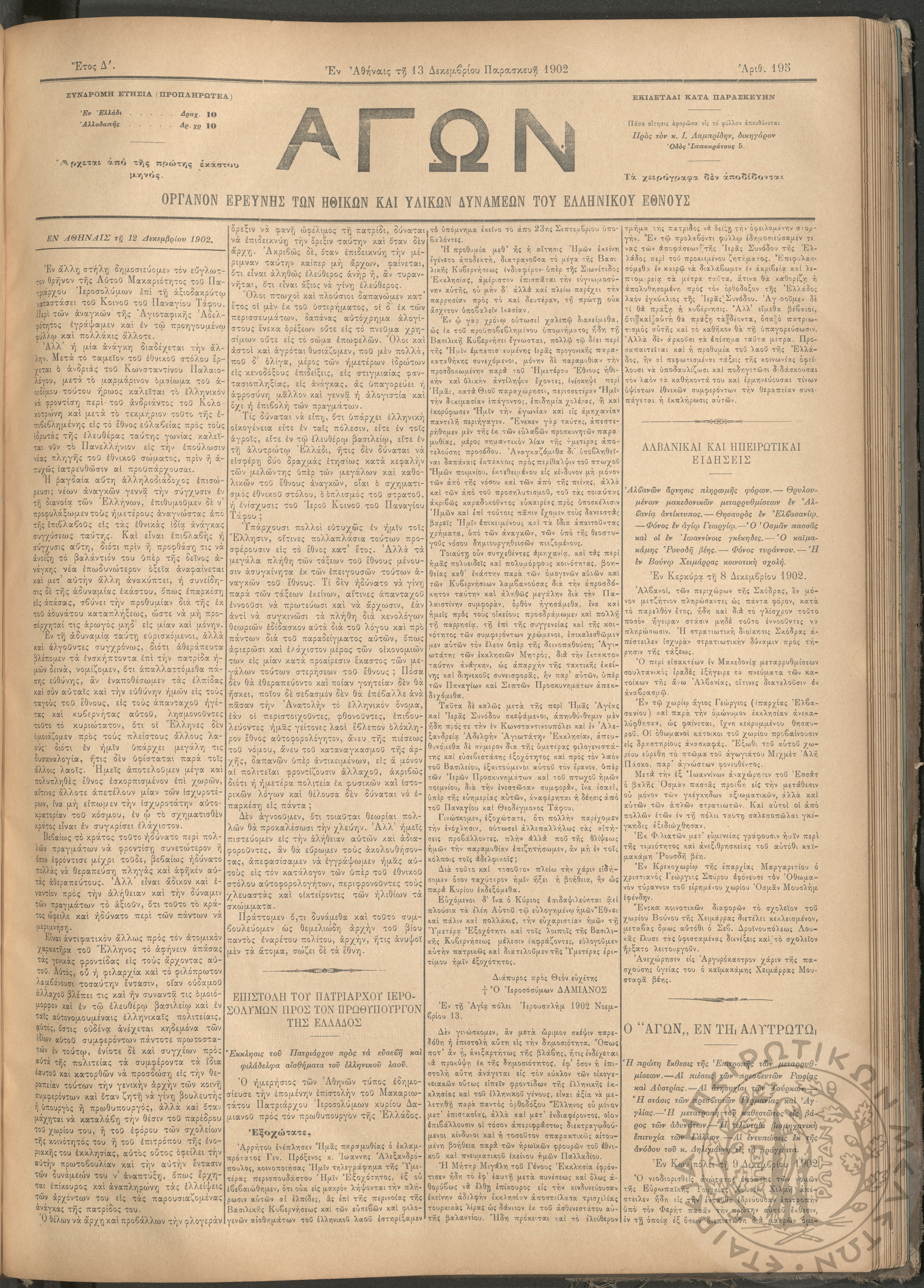 Αγών: Όργανον ερεύνης των ηθικών και υλικών δυνάμεων του Ελληνικού Έθνους, 1902 (Φ. 195)Έτος Δ΄, Φ. 195...