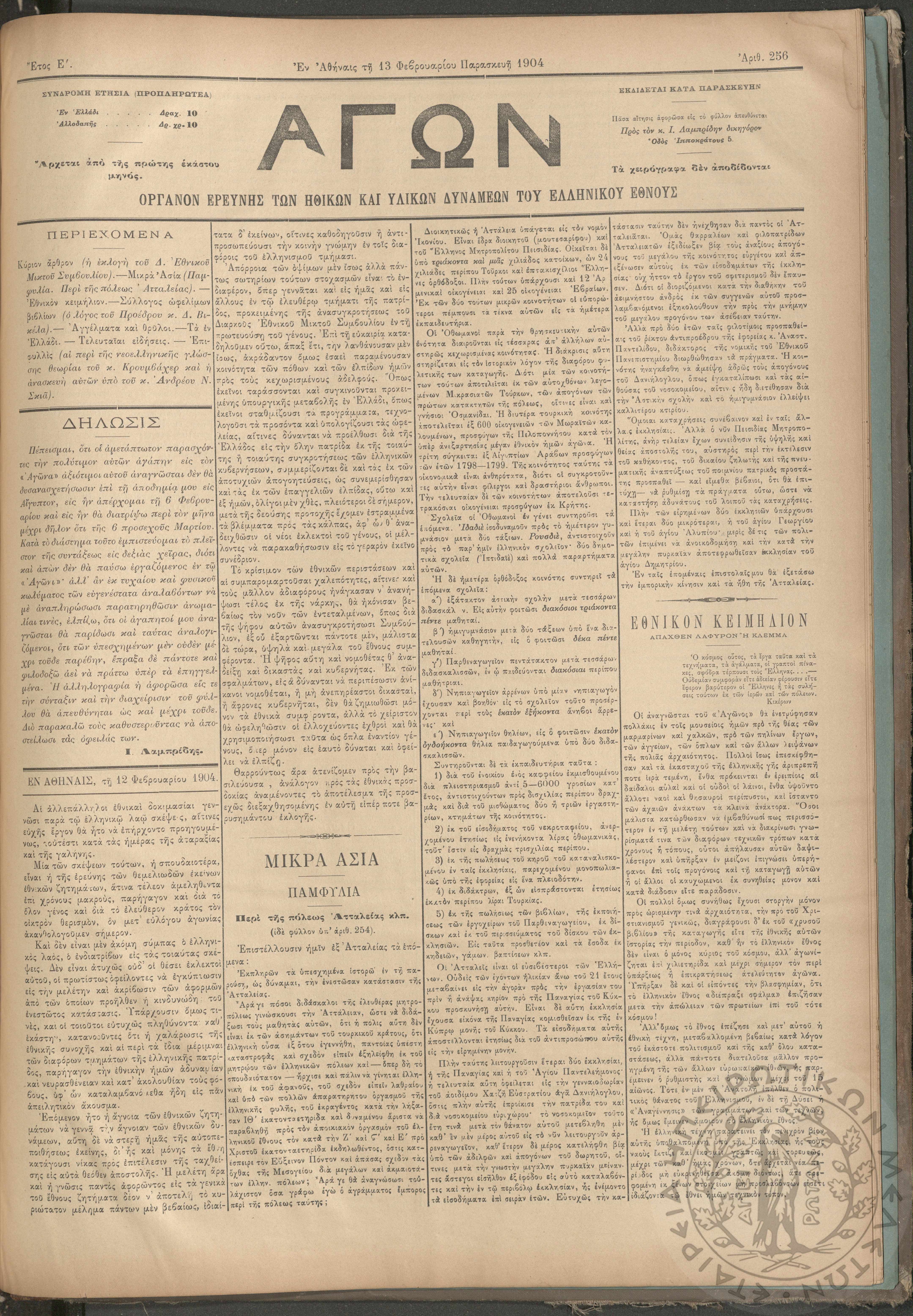 Αγών: Όργανον ερεύνης των ηθικών και υλικών δυνάμεων του Ελληνικού Έθνους, 1904 (Φ. 256)Έτος Ε΄, Φ. 256...