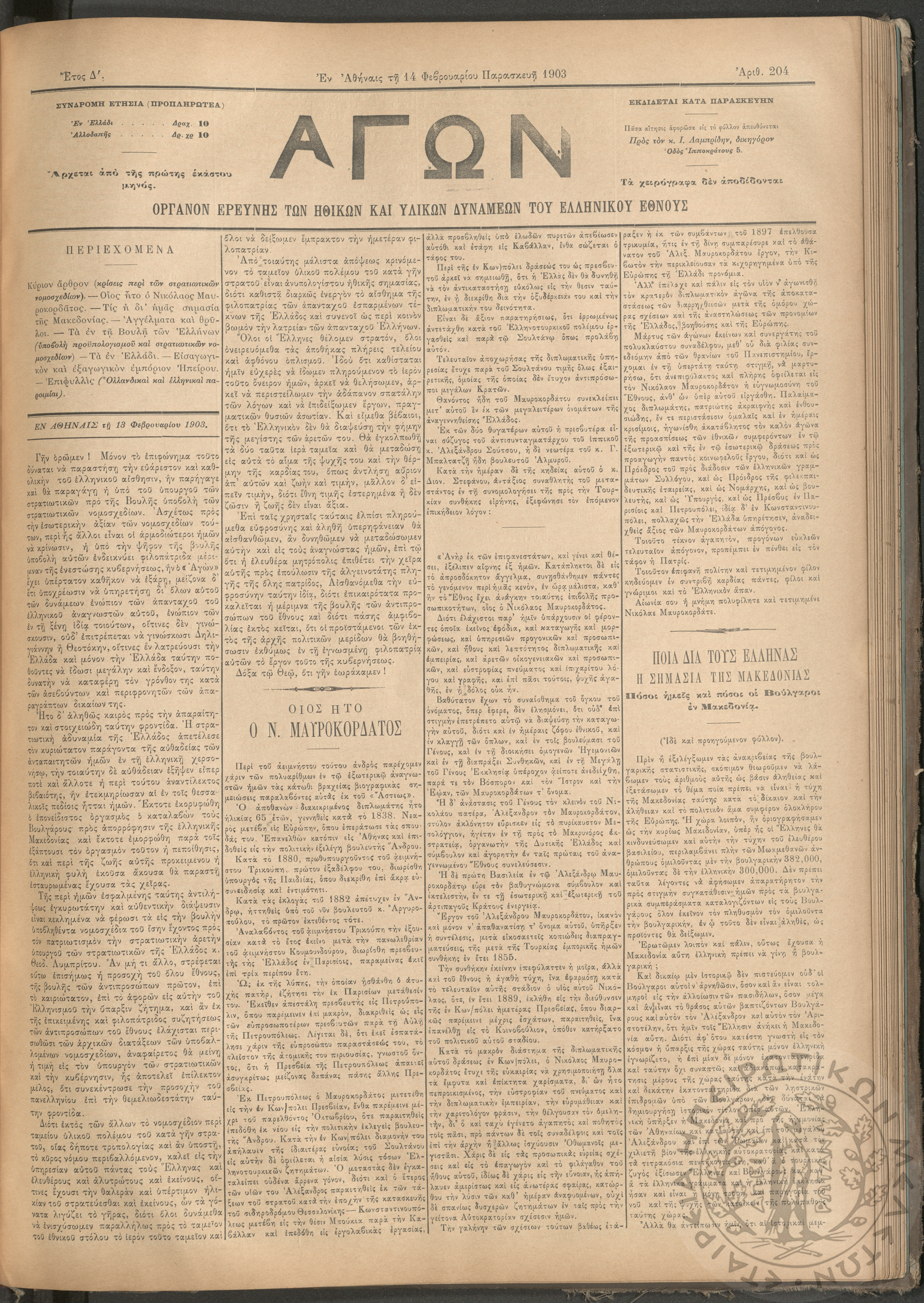 Αγών: Όργανον ερεύνης των ηθικών και υλικών δυνάμεων του Ελληνικού Έθνους, 1903 (Φ. 204)Έτος Δ΄, Φ. 204...