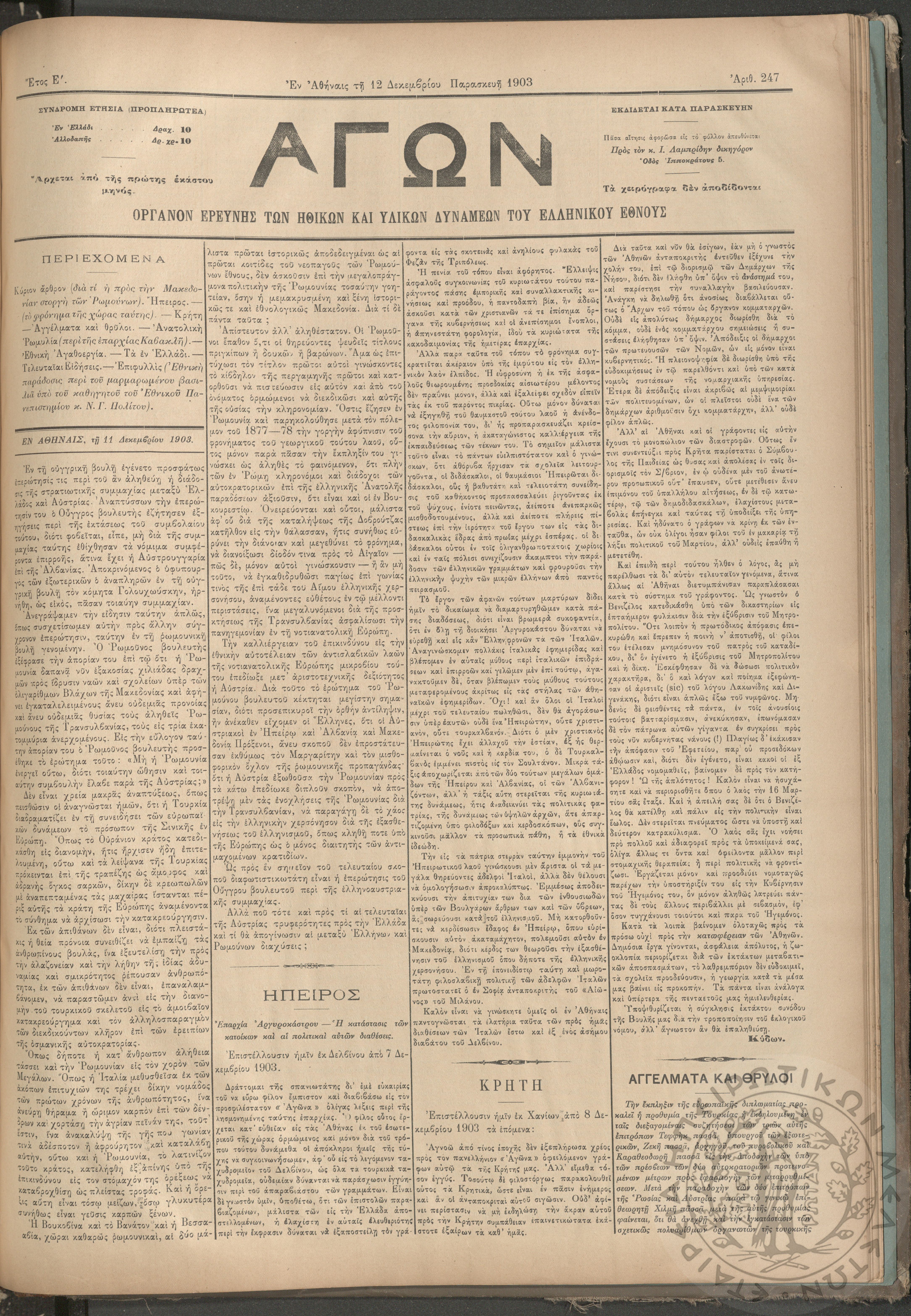Αγών: Όργανον ερεύνης των ηθικών και υλικών δυνάμεων του Ελληνικού Έθνους, 1903 (Φ. 247)Έτος Ε΄, Φ. 247...