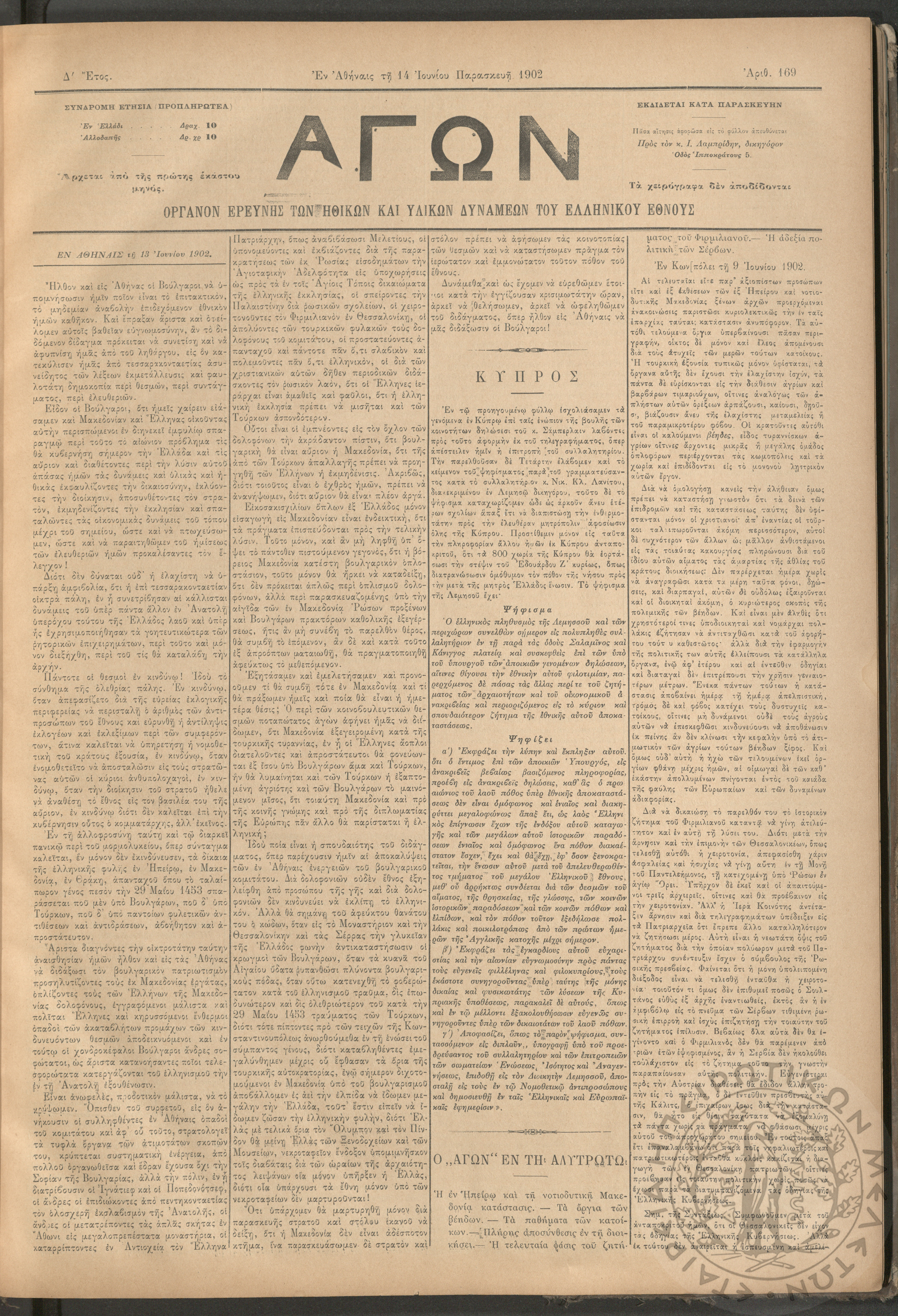Αγών: Όργανον ερεύνης των ηθικών και υλικών δυνάμεων του Ελληνικού Έθνους, 1902 (Φ. 169)Έτος Δ΄, Φ. 169...