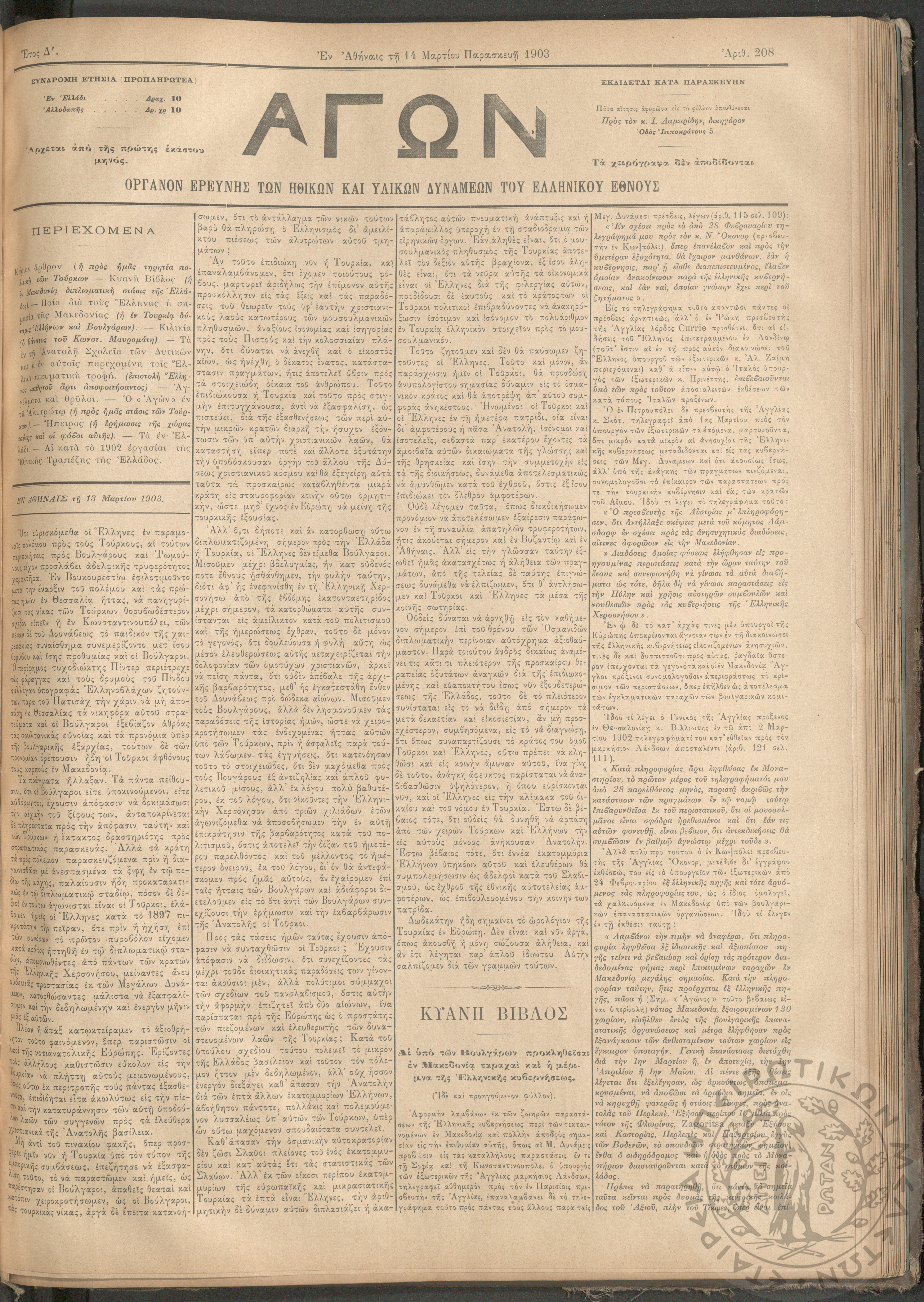 Αγών: Όργανον ερεύνης των ηθικών και υλικών δυνάμεων του Ελληνικού Έθνους, 1903 (Φ. 208)Έτος Δ΄, Φ. 208...