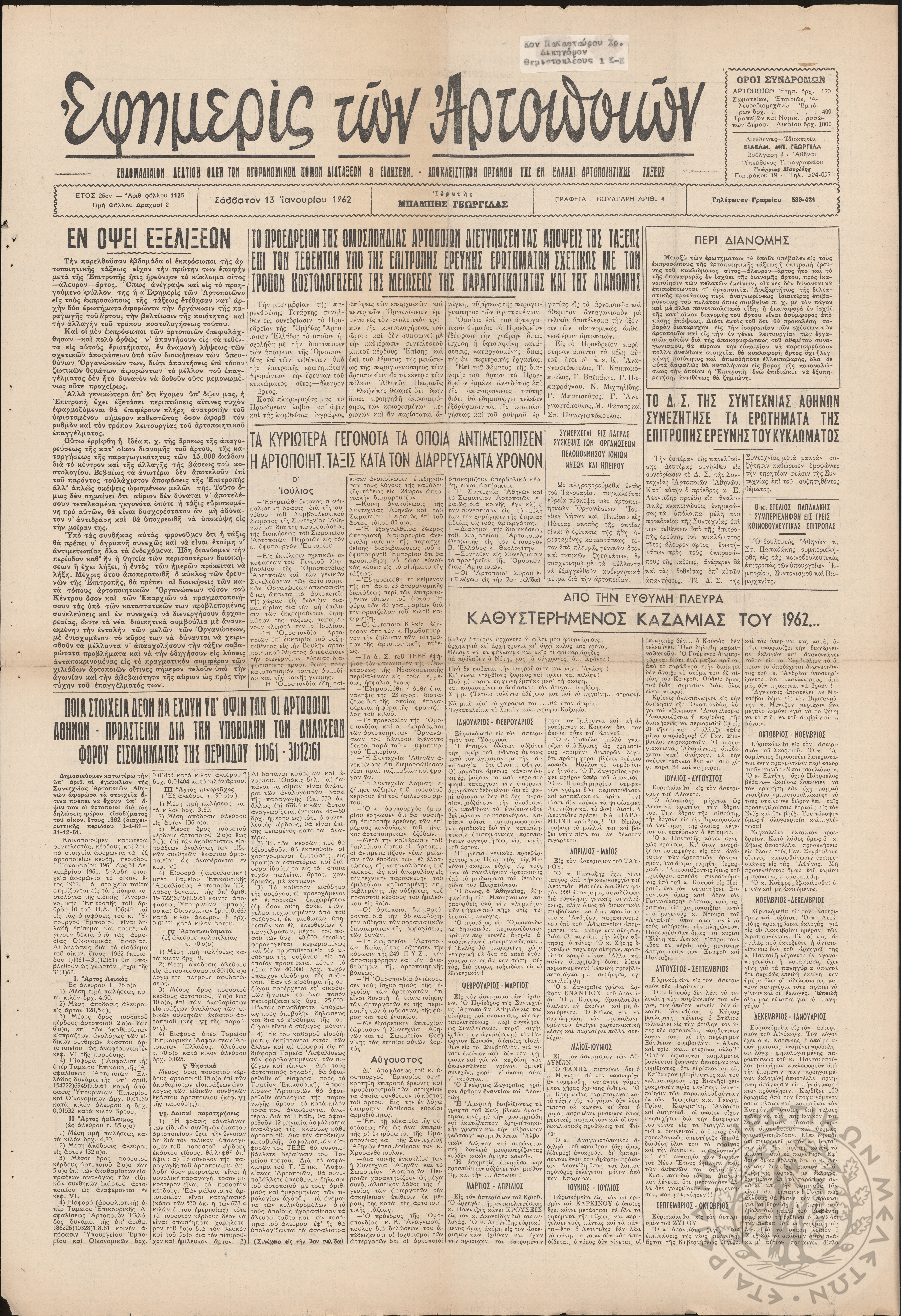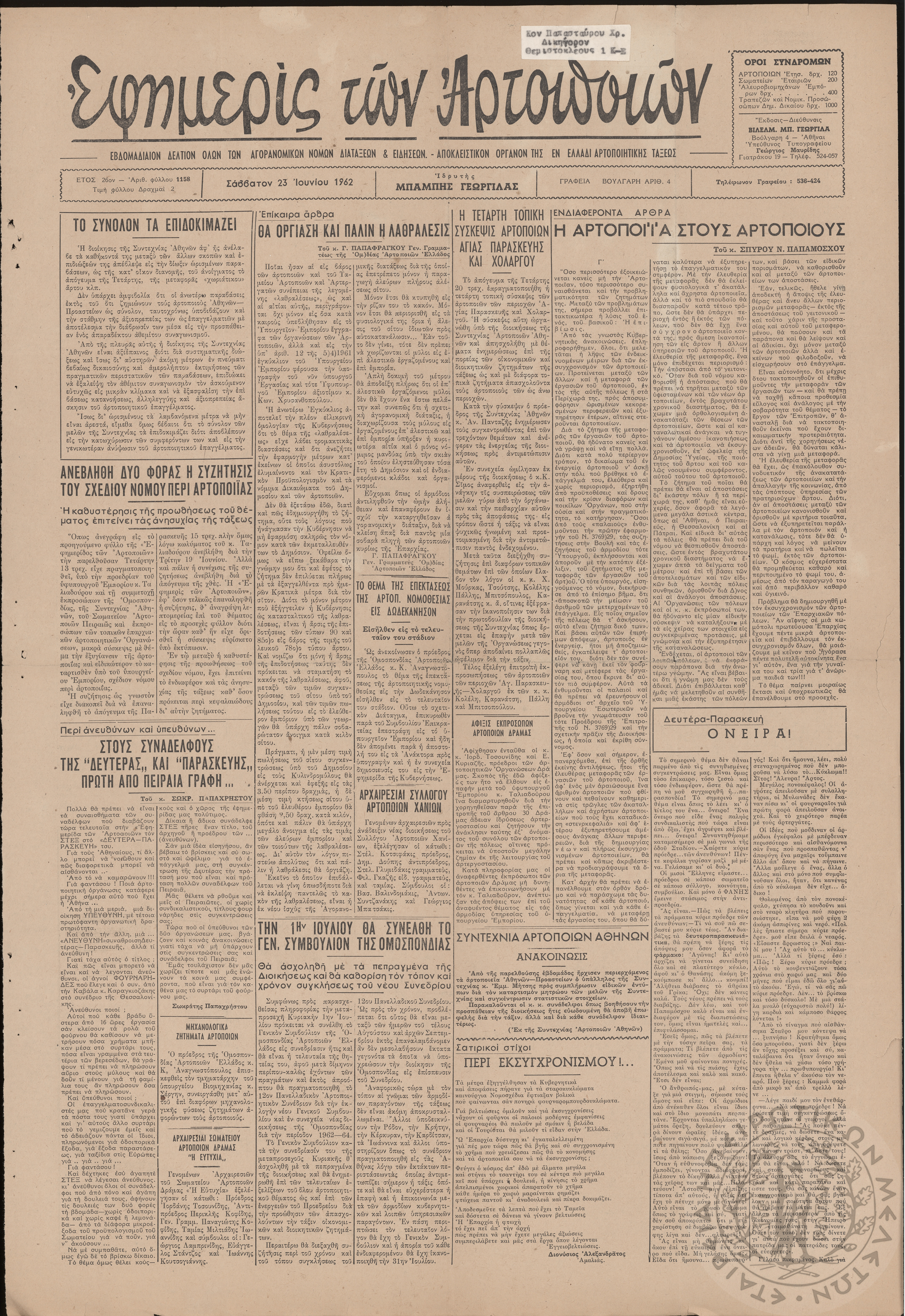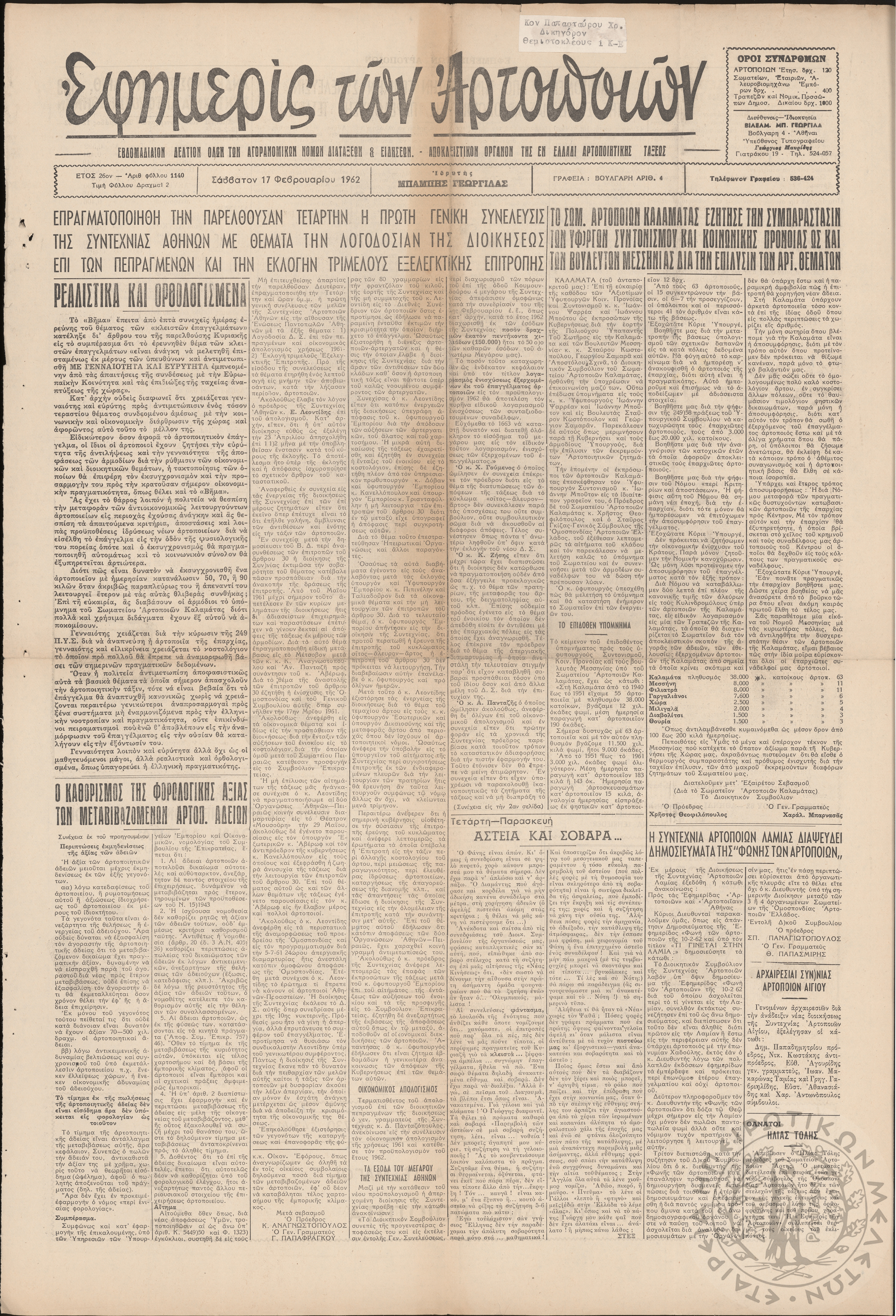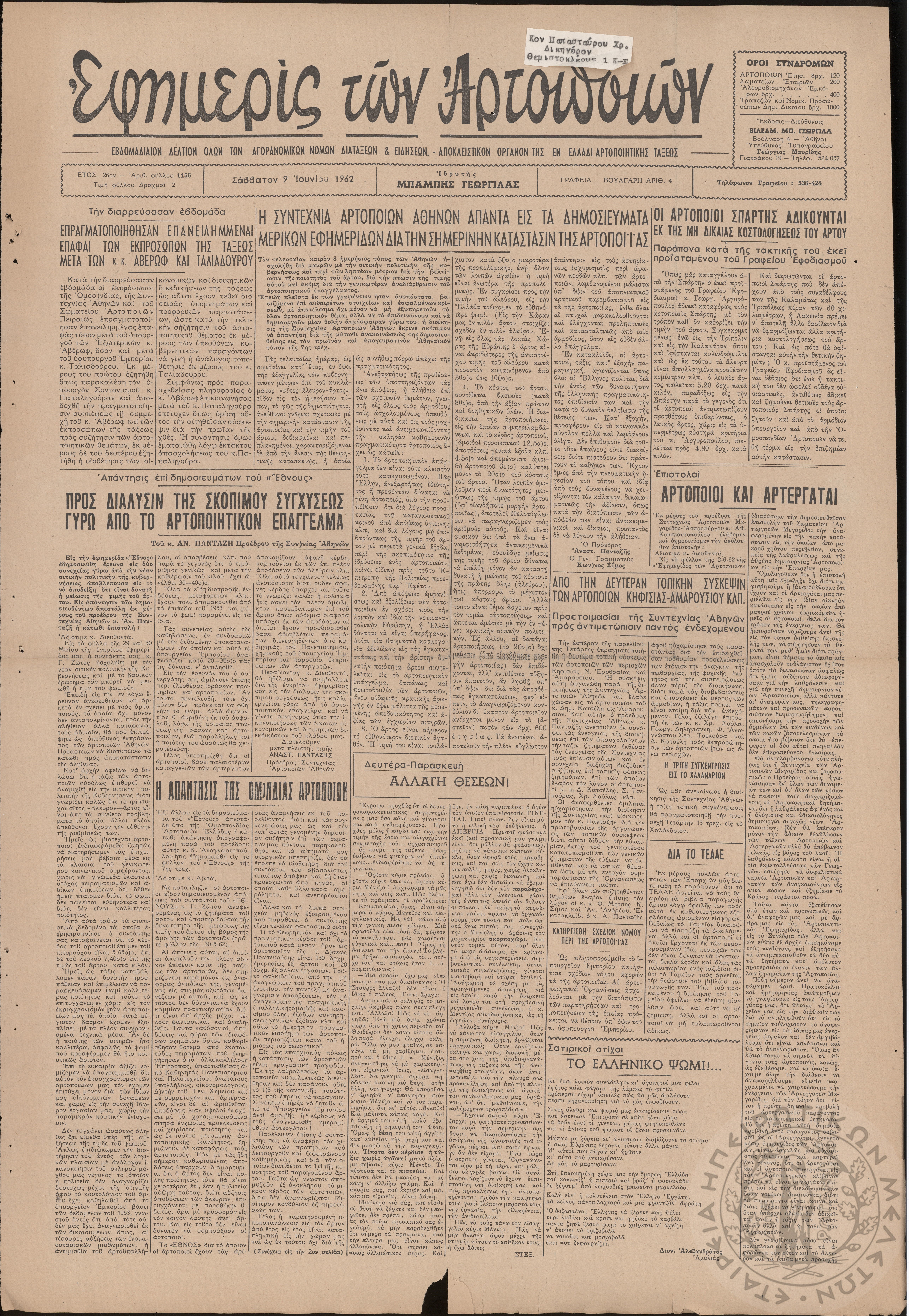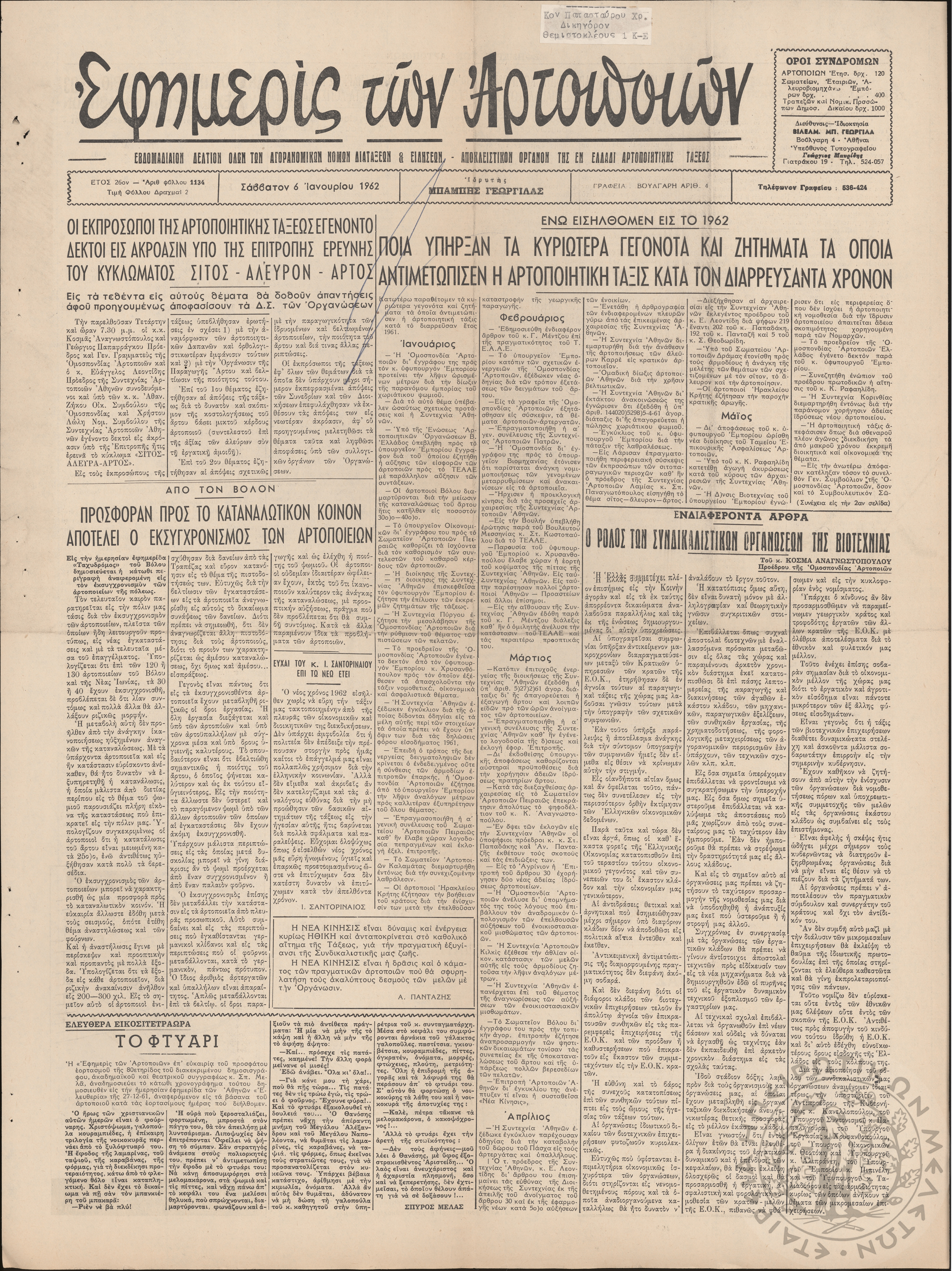 Εφημερίς των Αρτοποιών: εβδομαδιαίον δελτίον όλων των αγορανομικών νόμων, διατάξεων και ειδήσεων - αποκλειστικόν όργανον της εν Ελλάδι αρτοποιητικής τάξεως, 1962, φ. 1134Έτος 26ον, φ. 1134...