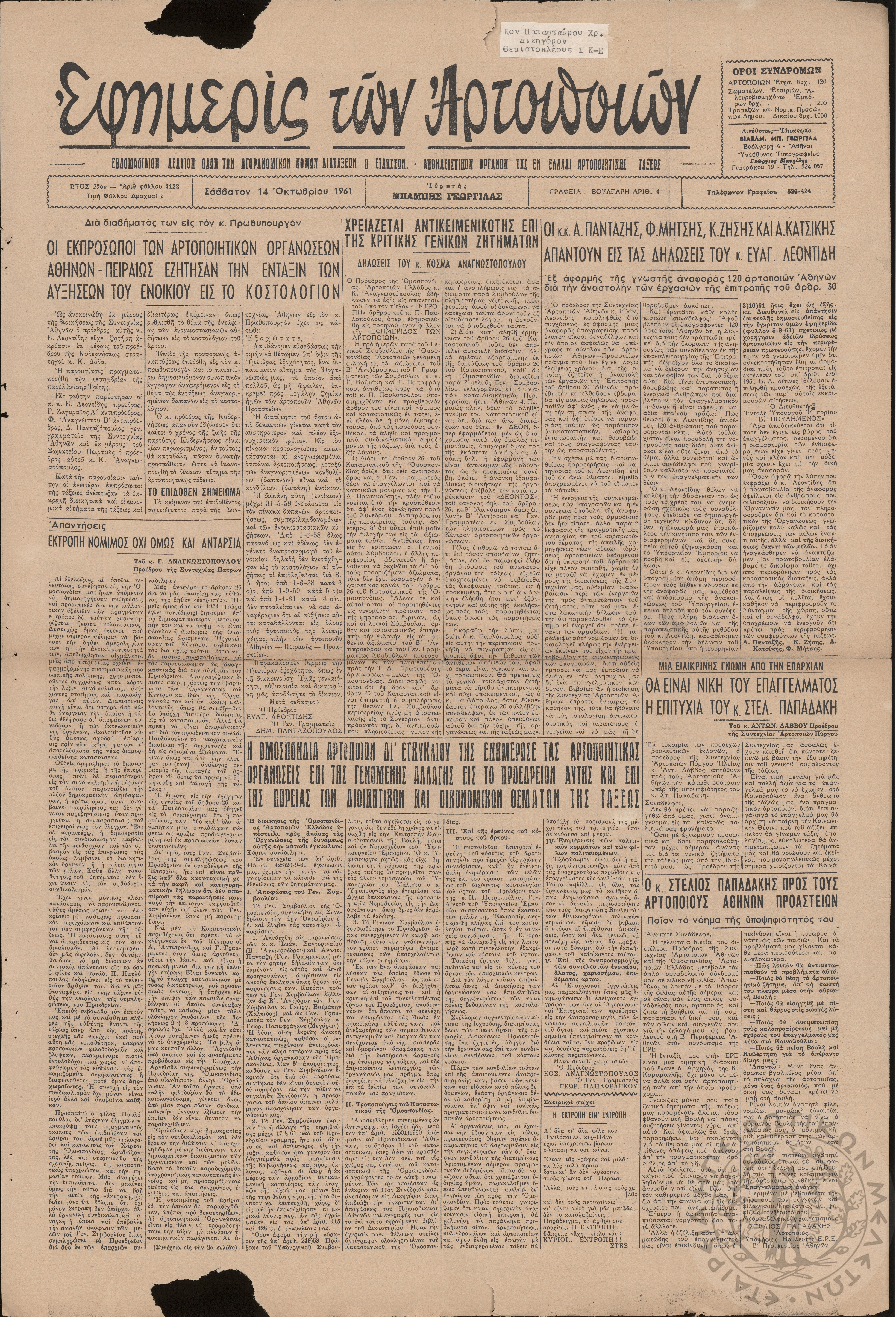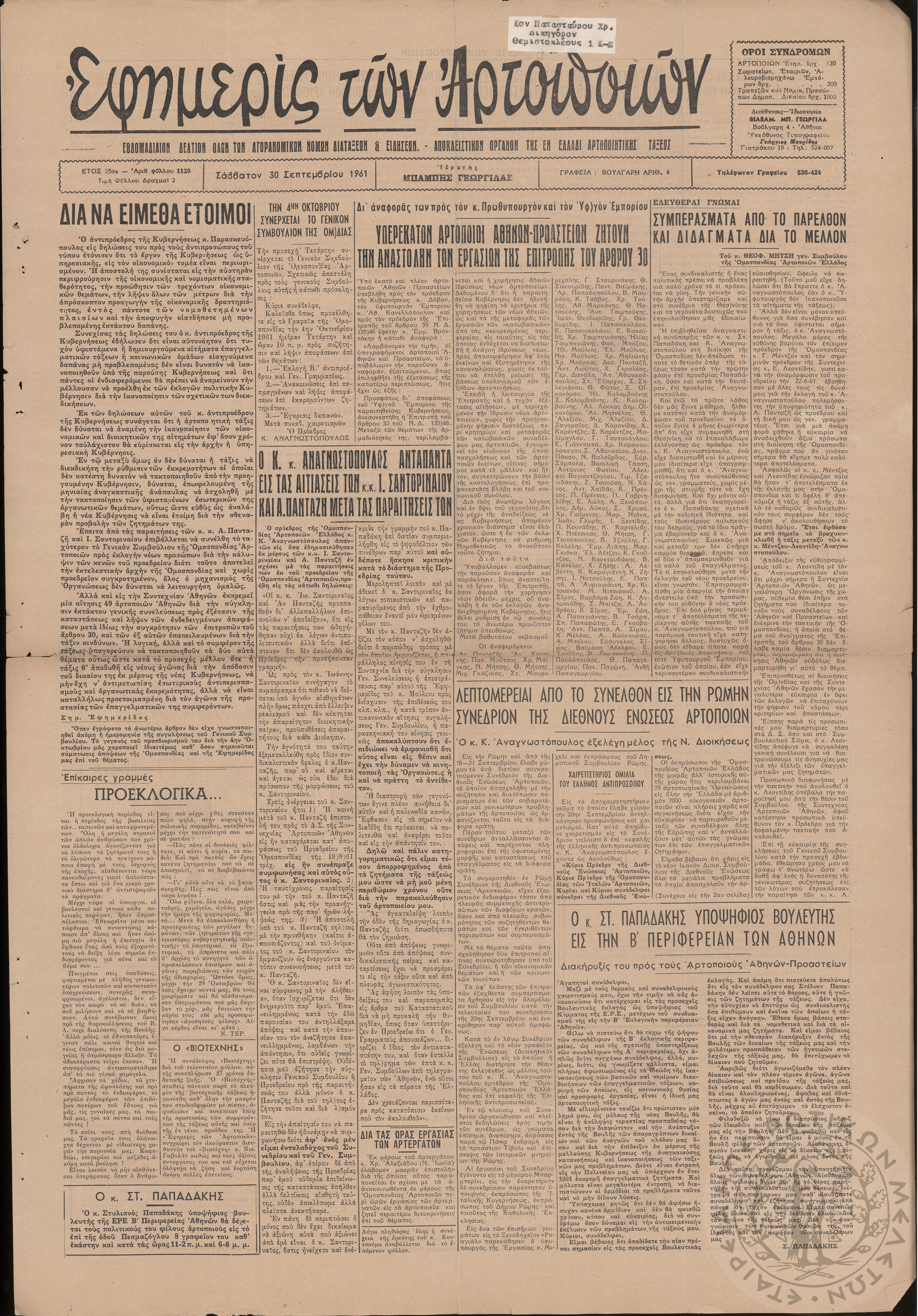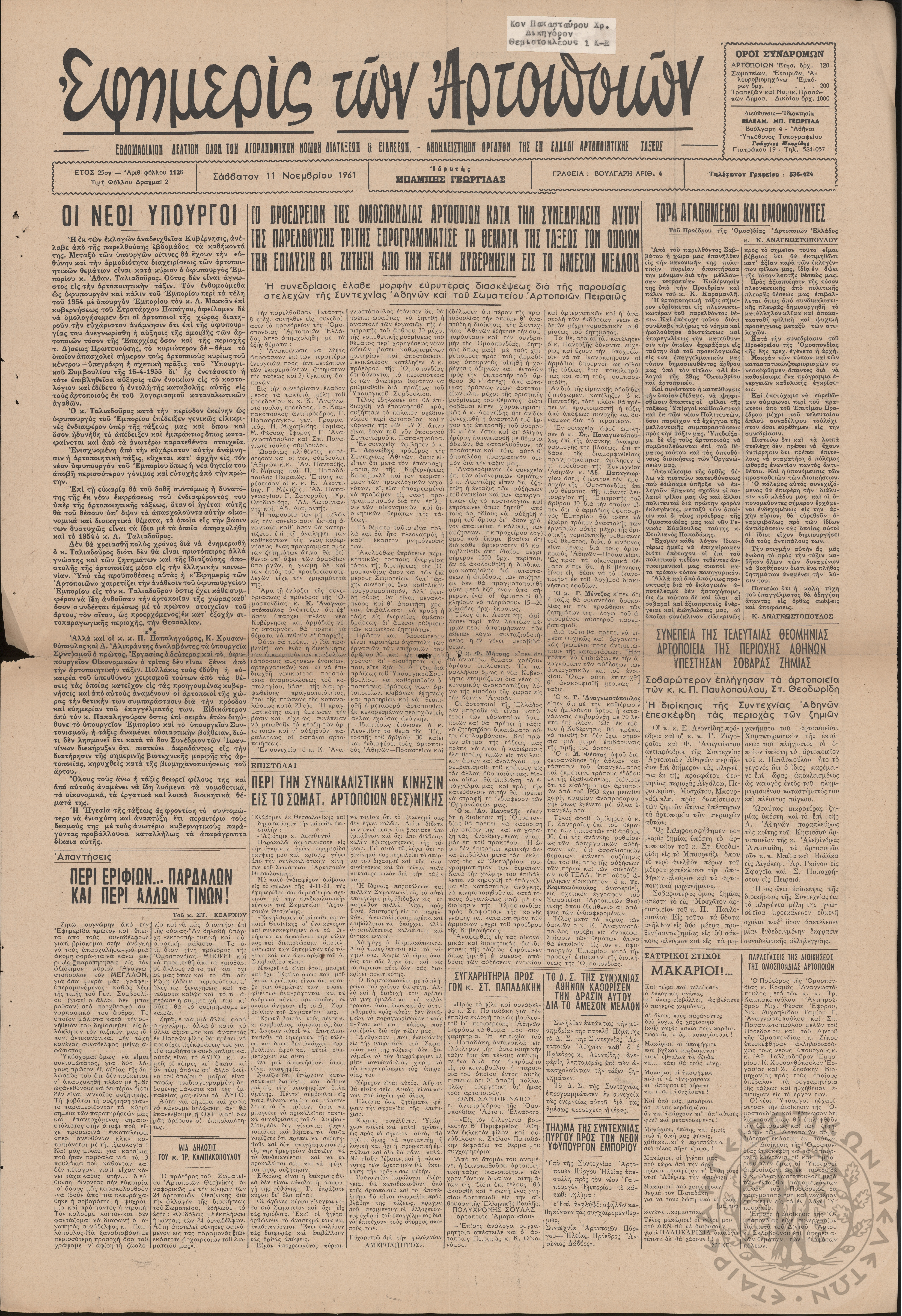 Εφημερίς των Αρτοποιών: εβδομαδιαίον δελτίον όλων των αγορανομικών νόμων, διατάξεων και ειδήσεων - αποκλειστικόν όργανον της εν Ελλάδι αρτοποιητικής τάξεως, 1961, φ. 1122Έτος 25ον, φ. 1122...