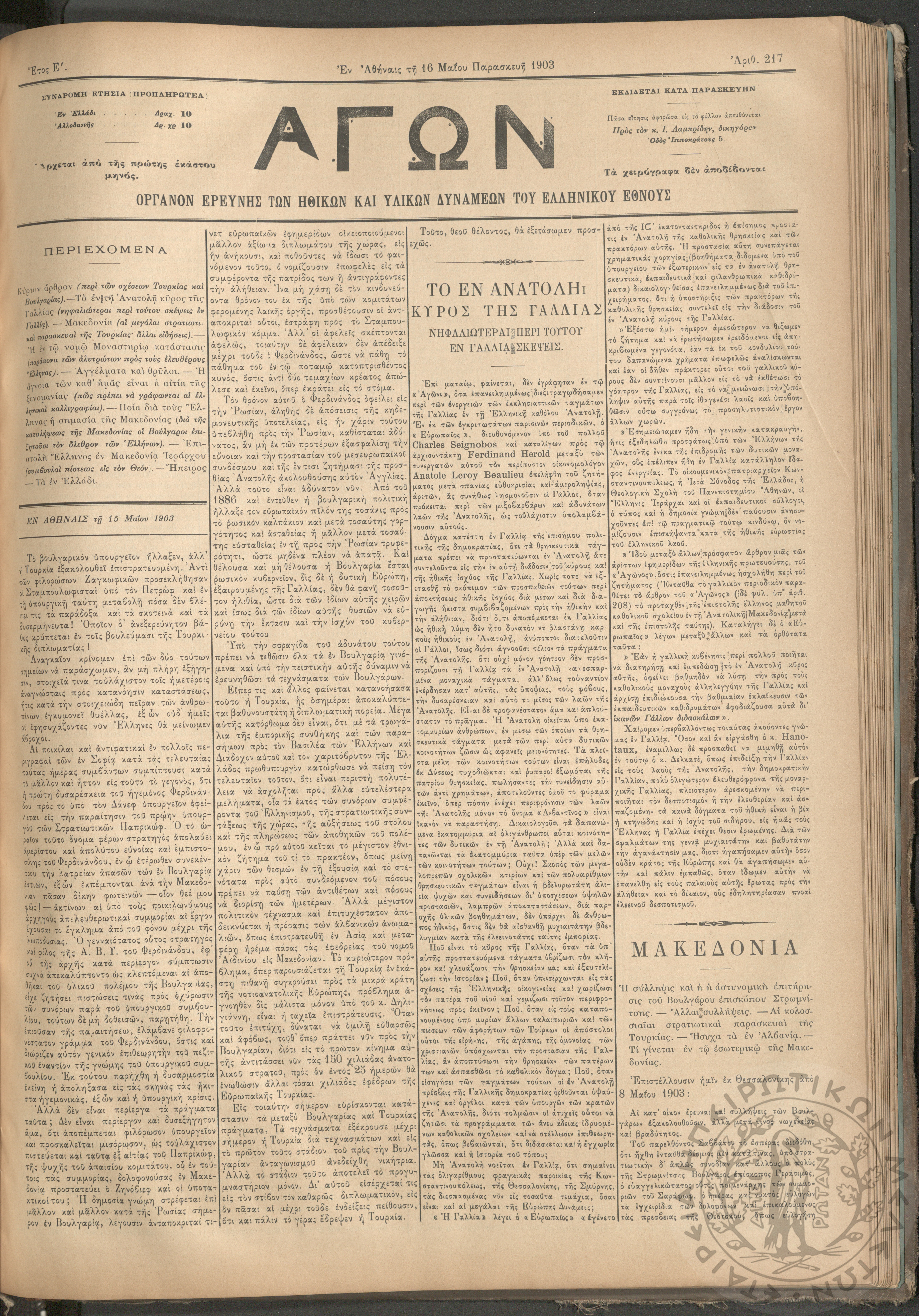 Αγών: Όργανον ερεύνης των ηθικών και υλικών δυνάμεων του Ελληνικού Έθνους, 1903 (Φ. 217)Έτος Ε΄, Φ. 217...