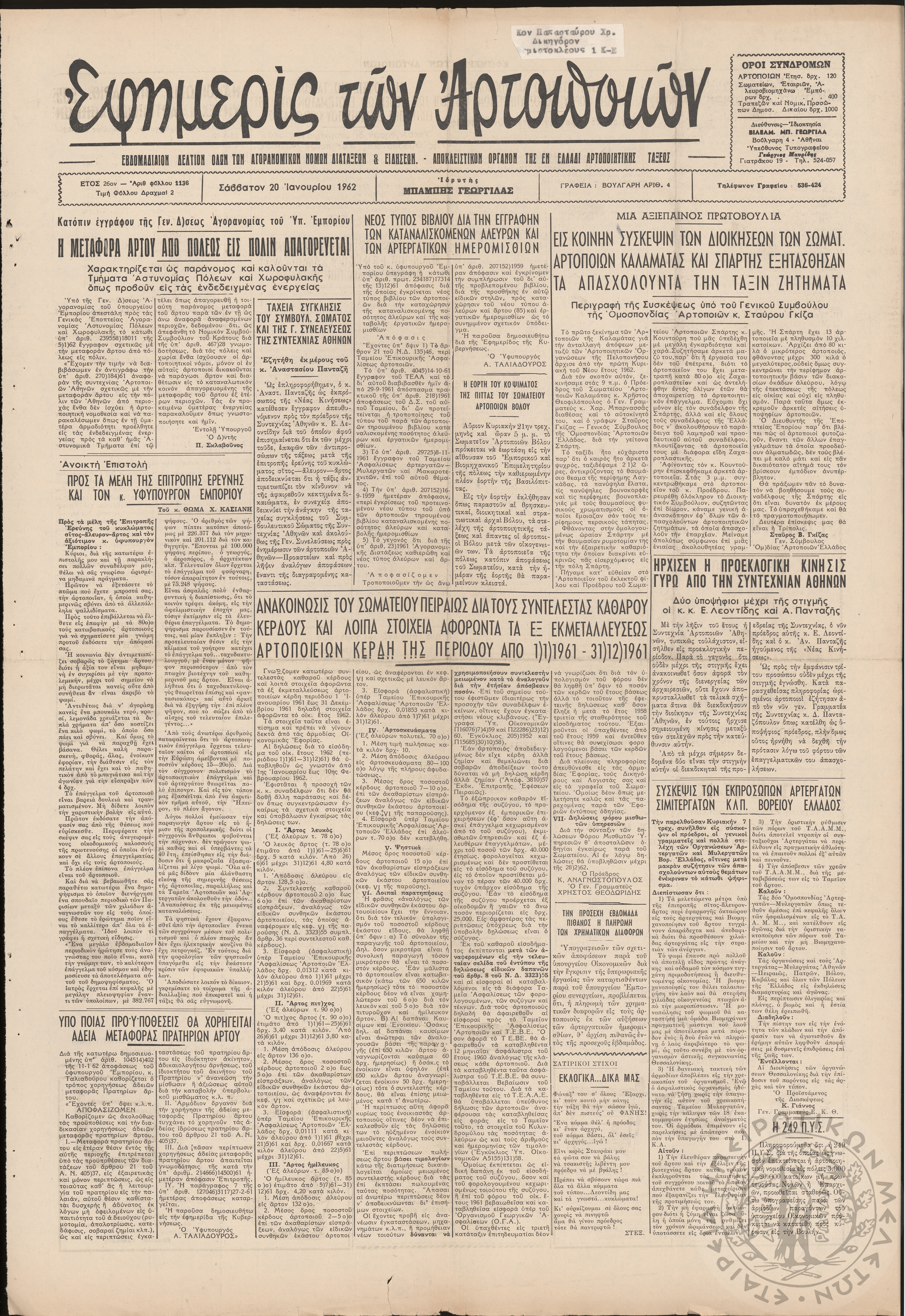 Εφημερίς των Αρτοποιών: εβδομαδιαίον δελτίον όλων των αγορανομικών νόμων, διατάξεων και ειδήσεων - αποκλειστικόν όργανον της εν Ελλάδι αρτοποιητικής τάξεως, 1962, φ. 1136Έτος 26ον, φ. 1136...
