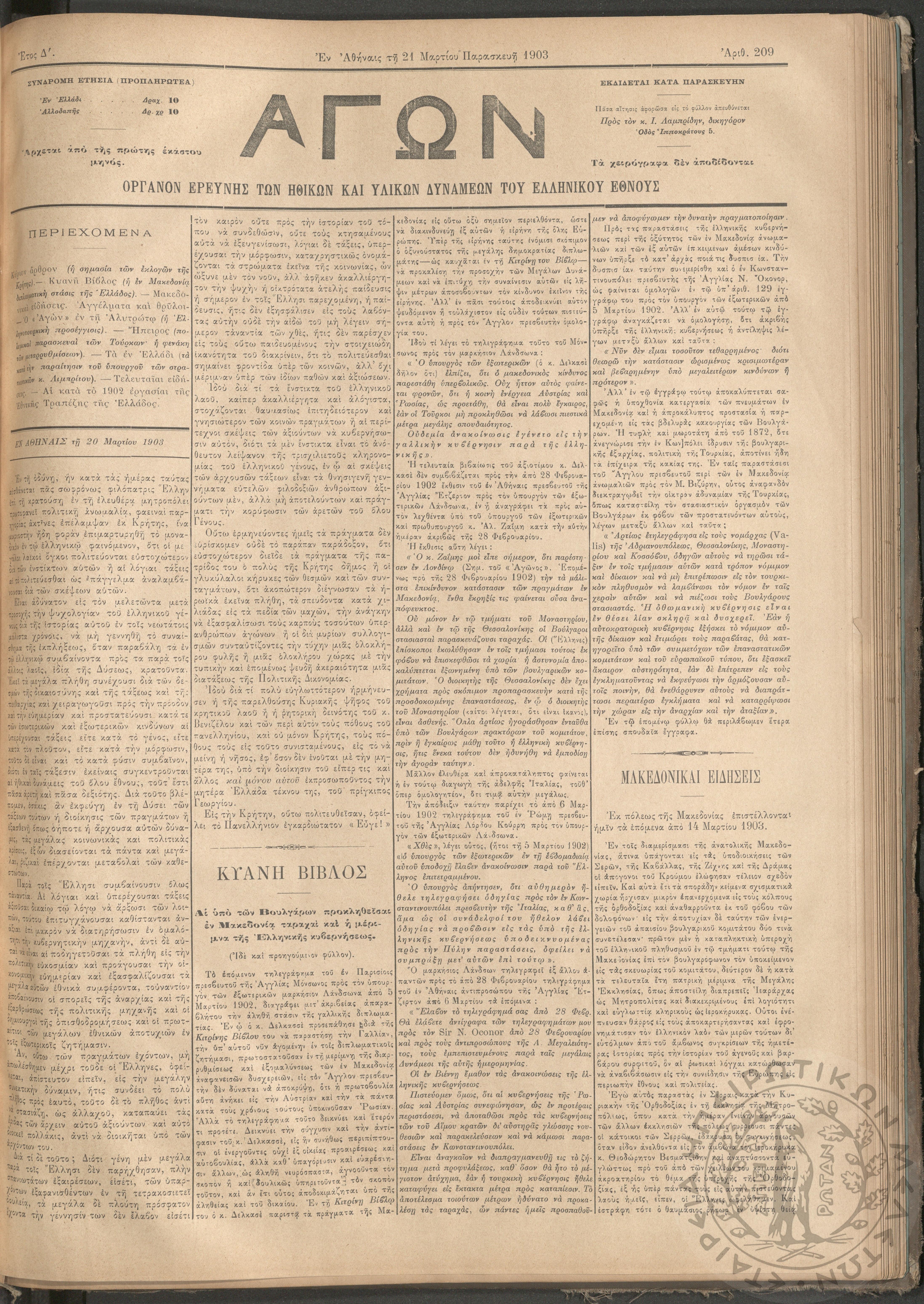 Αγών: Όργανον ερεύνης των ηθικών και υλικών δυνάμεων του Ελληνικού Έθνους, 1903 (Φ. 209)Έτος Δ΄, Φ. 209...