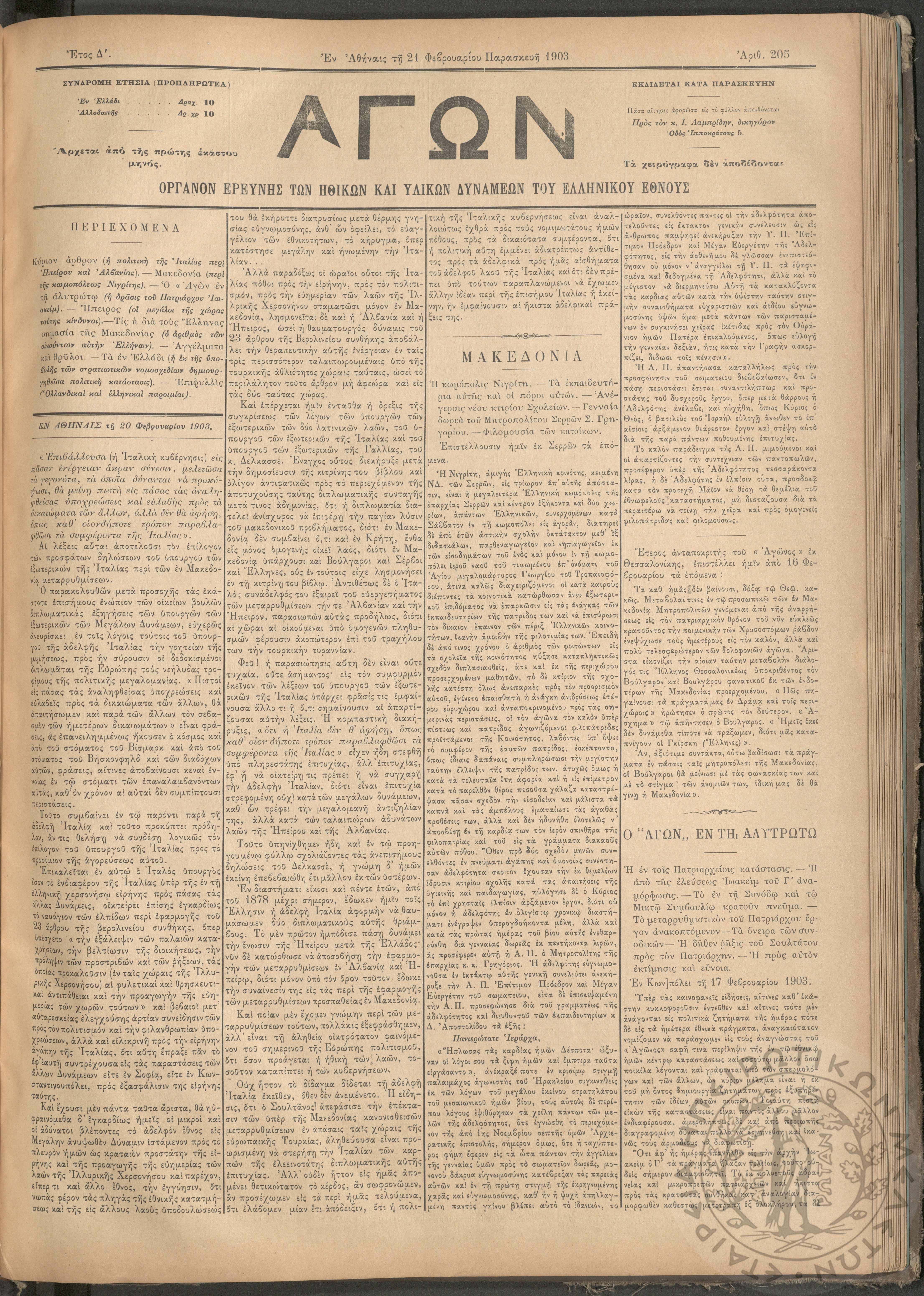 Αγών: Όργανον ερεύνης των ηθικών και υλικών δυνάμεων του Ελληνικού Έθνους,1903 (Φ. 205)Έτος Δ΄, Φ. 205...