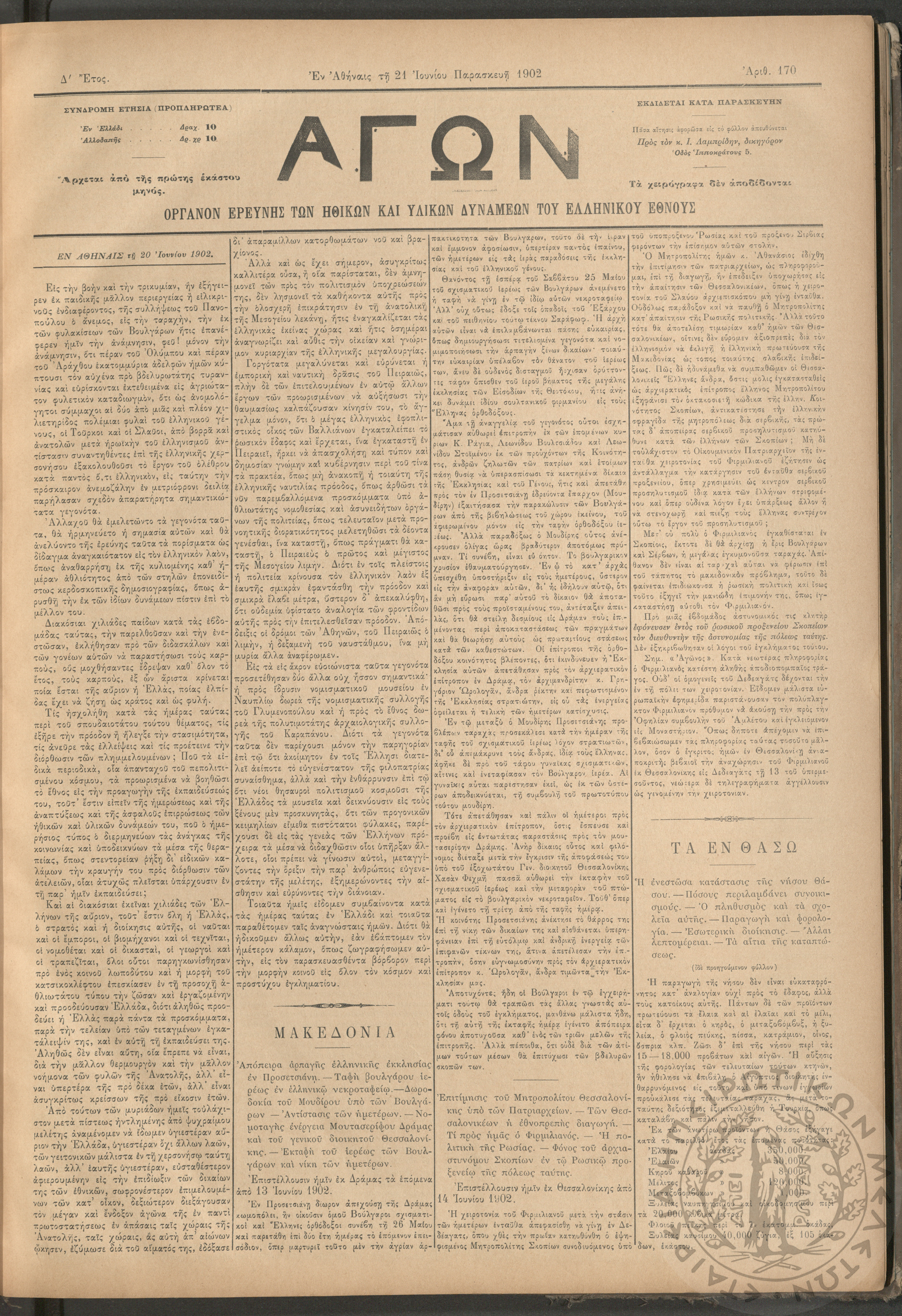 Αγών: Όργανον ερεύνης των ηθικών και υλικών δυνάμεων του Ελληνικού Έθνους, 1902 (Φ. 170)Έτος Δ΄, Φ. 170...