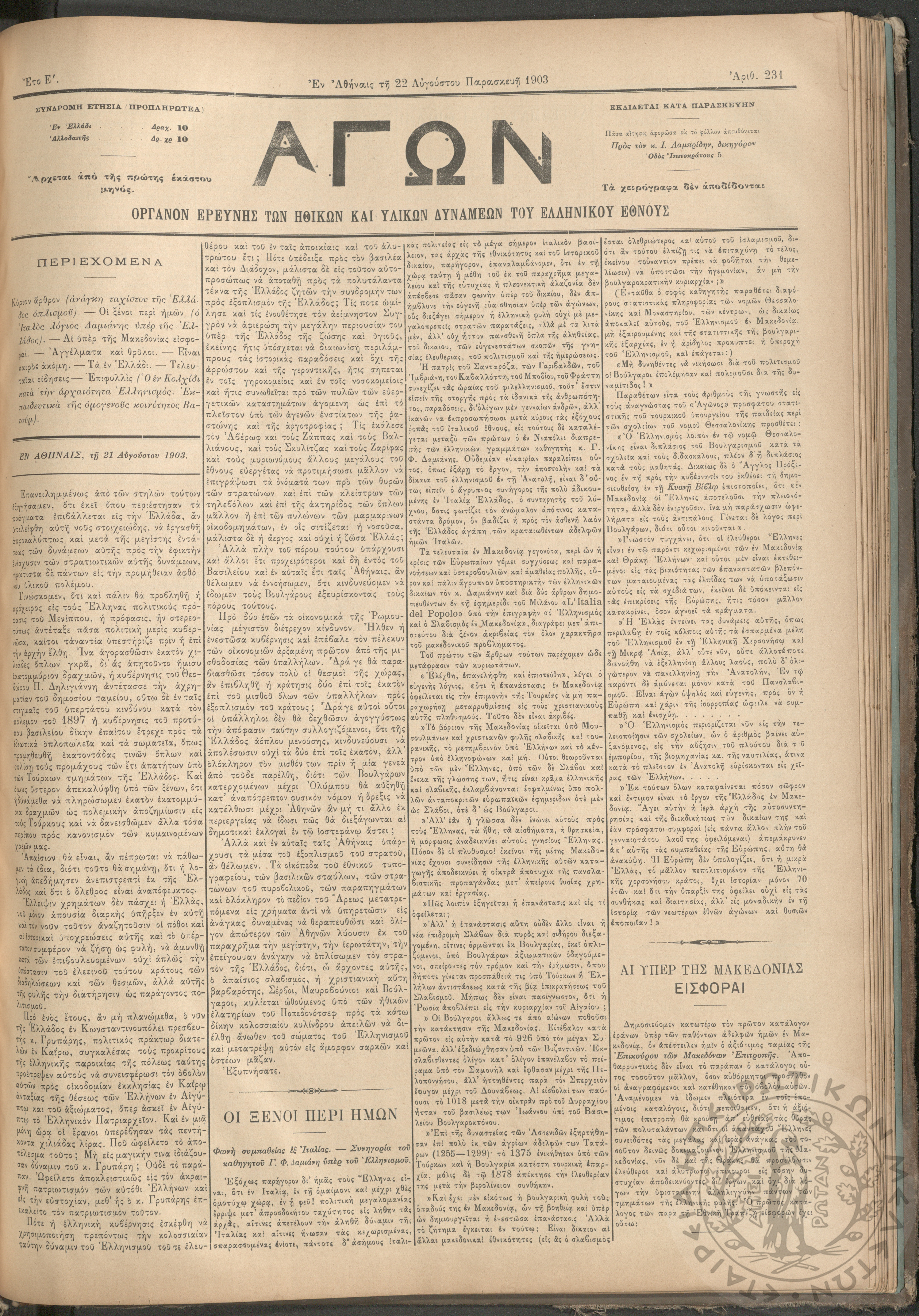 Αγών: Όργανον ερεύνης των ηθικών και υλικών δυνάμεων του Ελληνικού Έθνους, 1903 (Φ. 231)Έτος Ε΄, Φ. 231...