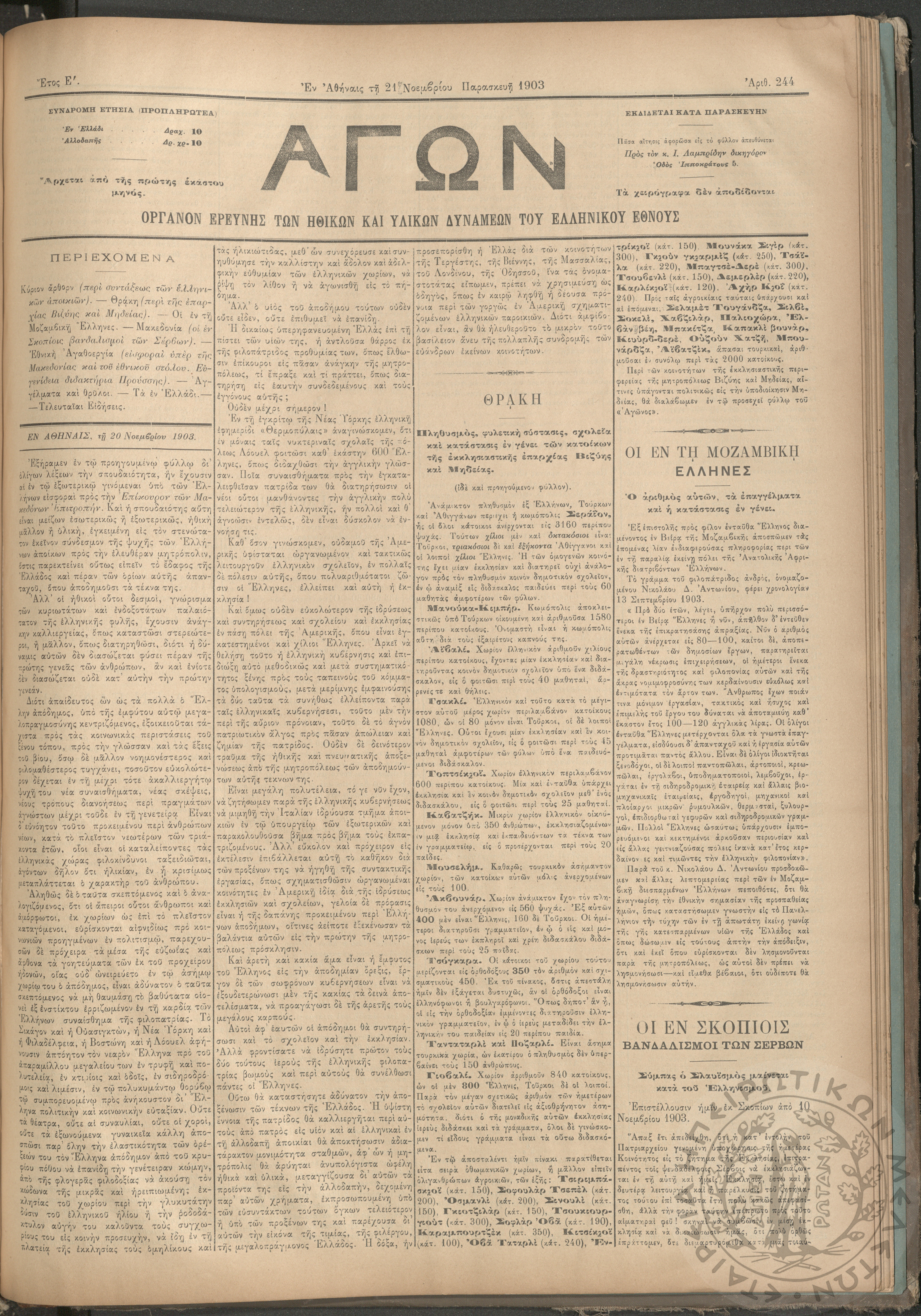 Αγών: Όργανον ερεύνης των ηθικών και υλικών δυνάμεων του Ελληνικού Έθνους, 1903 (Φ. 244)Έτος Ε΄, Φ. 244...