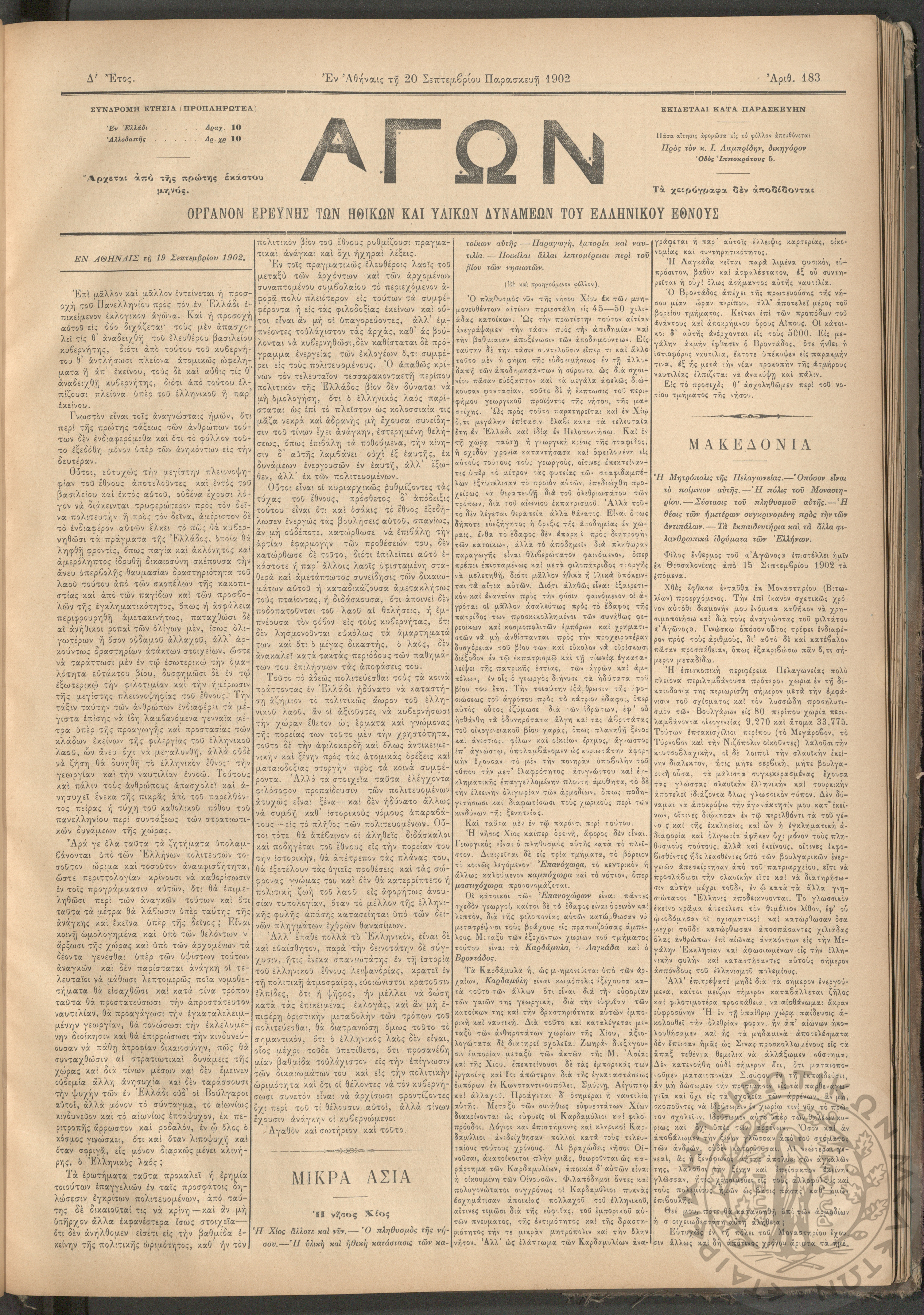 Αγών: Όργανον ερεύνης των ηθικών και υλικών δυνάμεων του Ελληνικού Έθνους, 1902 (Φ. 183)Έτος Δ΄, Φ. 183...
