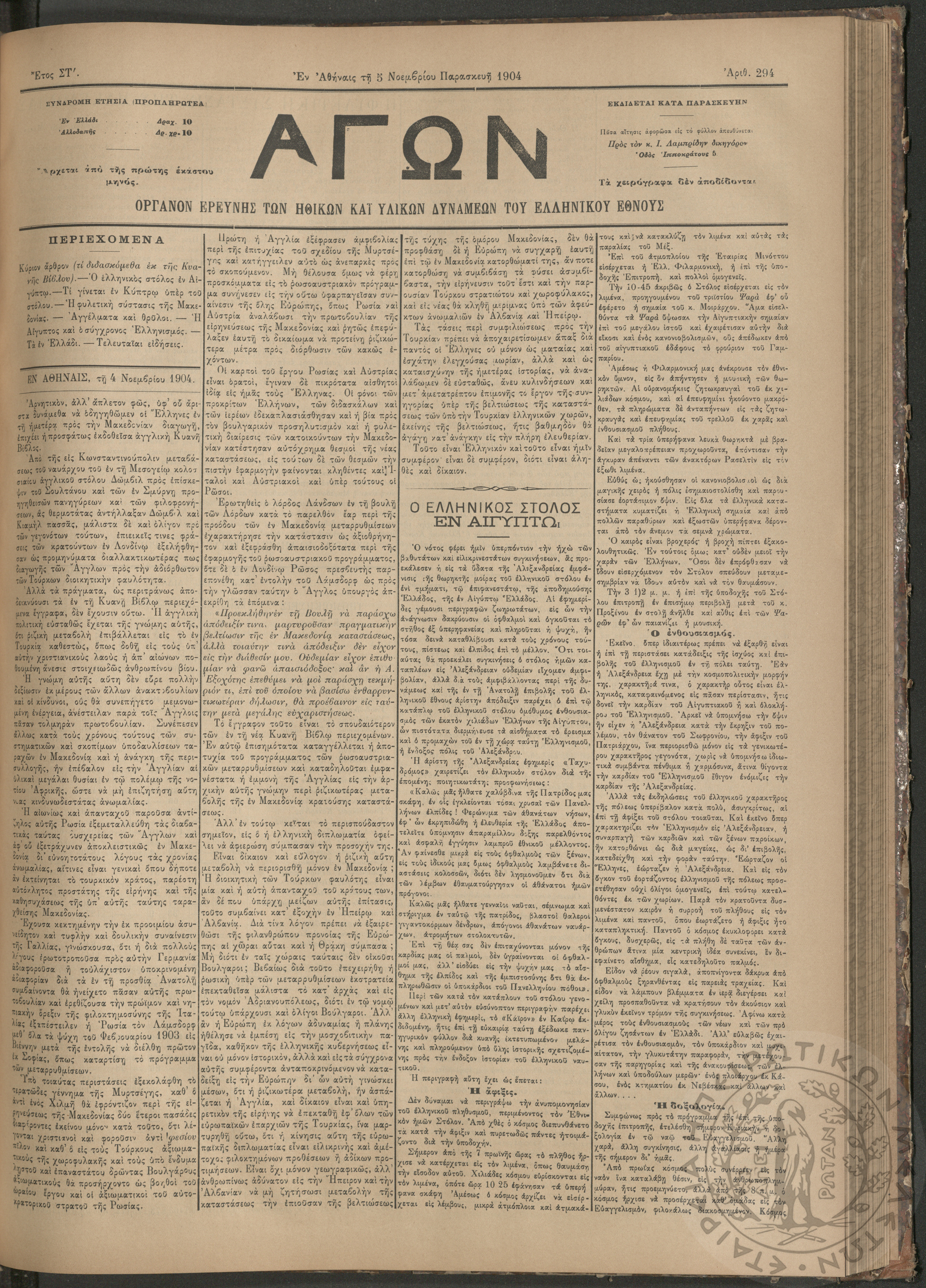 Αγών: Όργανον ερεύνης των ηθικών και υλικών δυνάμεων του Ελληνικού Έθνους, 1904 (Φ. 294)Έτος ΣΤ΄, Φ. 294...
