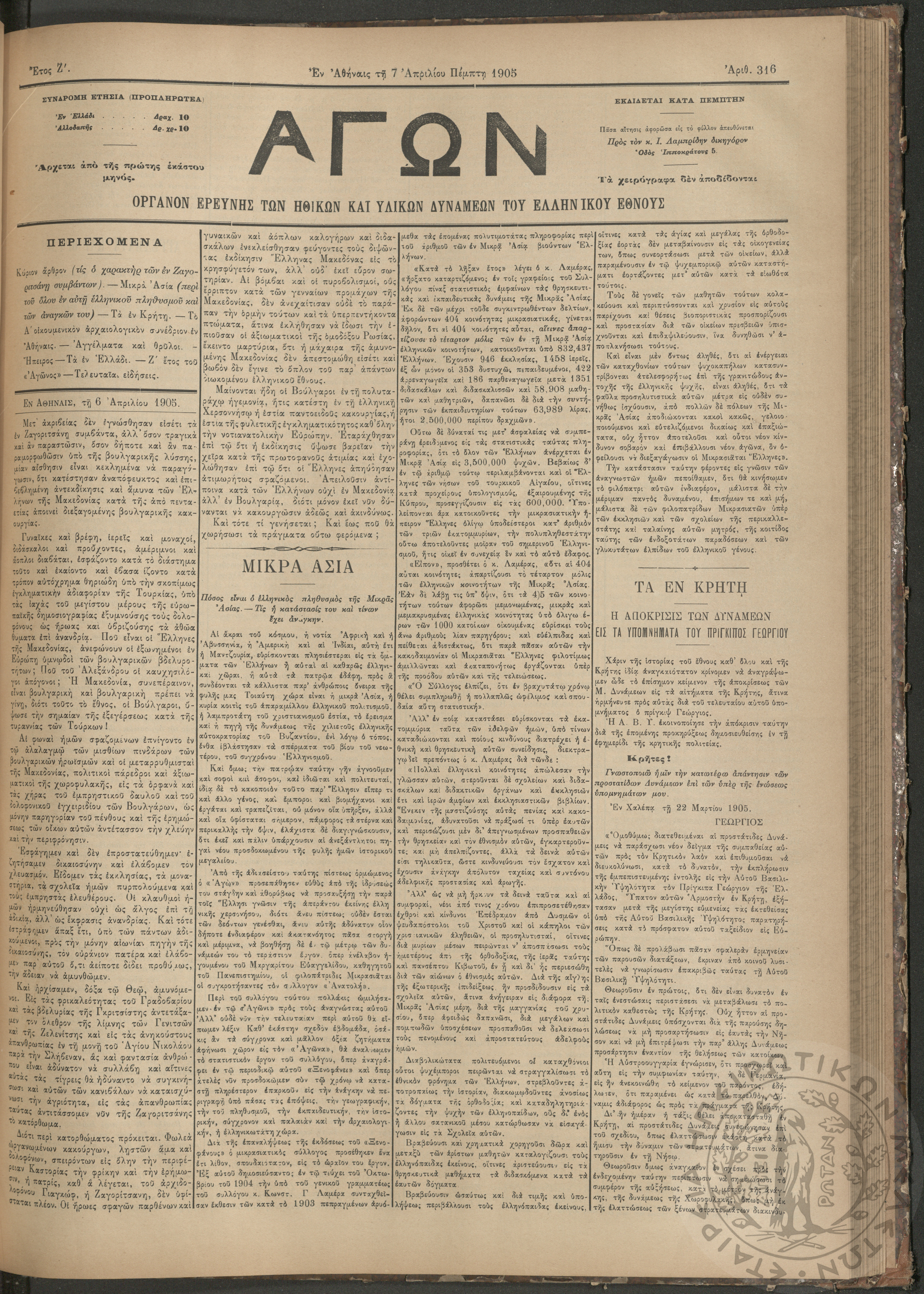 Αγών: Όργανον ερεύνης των ηθικών και υλικών δυνάμεων του Ελληνικού Έθνους, 1905 (Φ. 316)Έτος Ζ΄, Φ. 316...