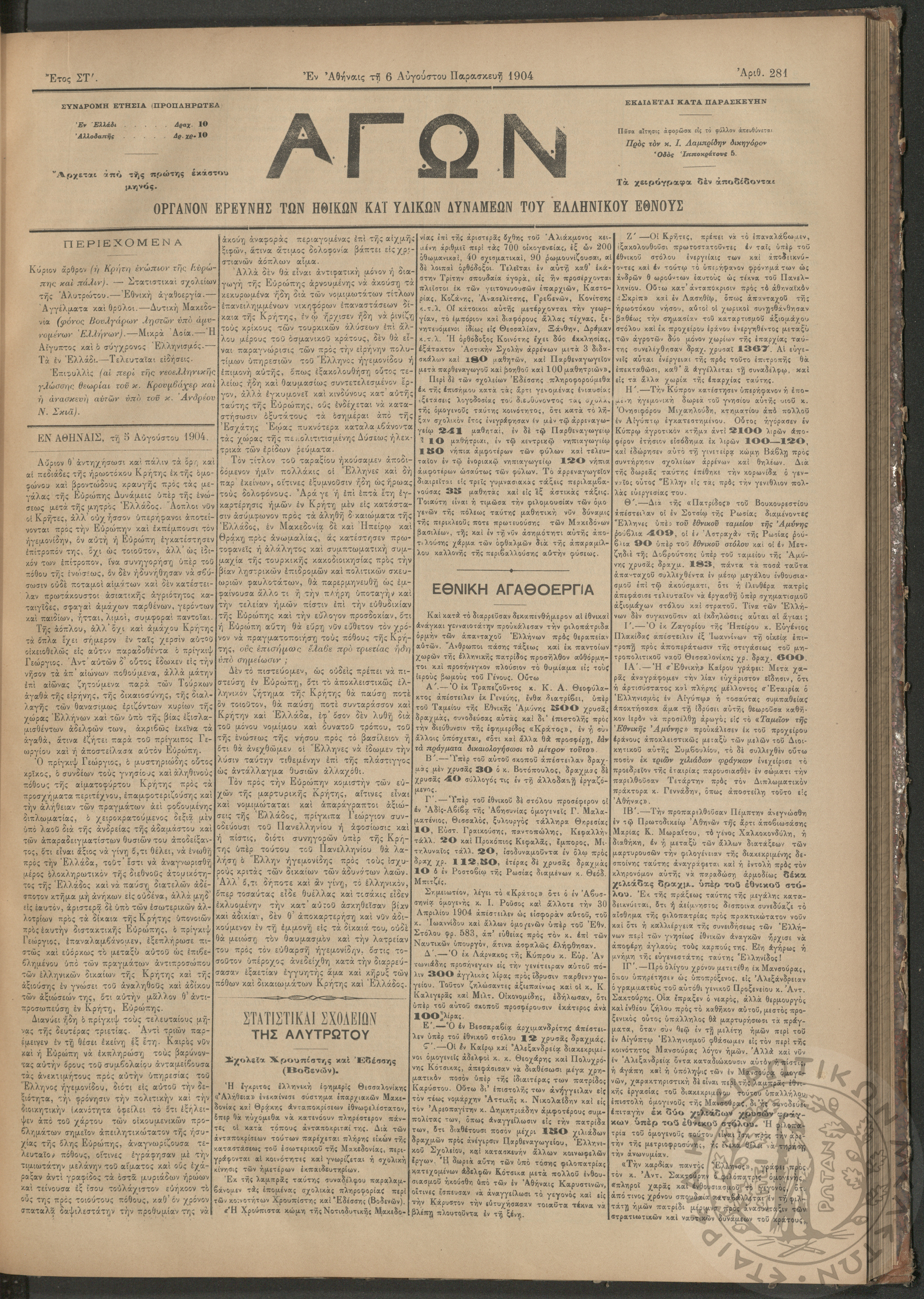 Αγών: Όργανον ερεύνης των ηθικών και υλικών δυνάμεων του Ελληνικού Έθνους, 1904 (Φ. 281)Έτος ΣΤ΄, Φ. 281...