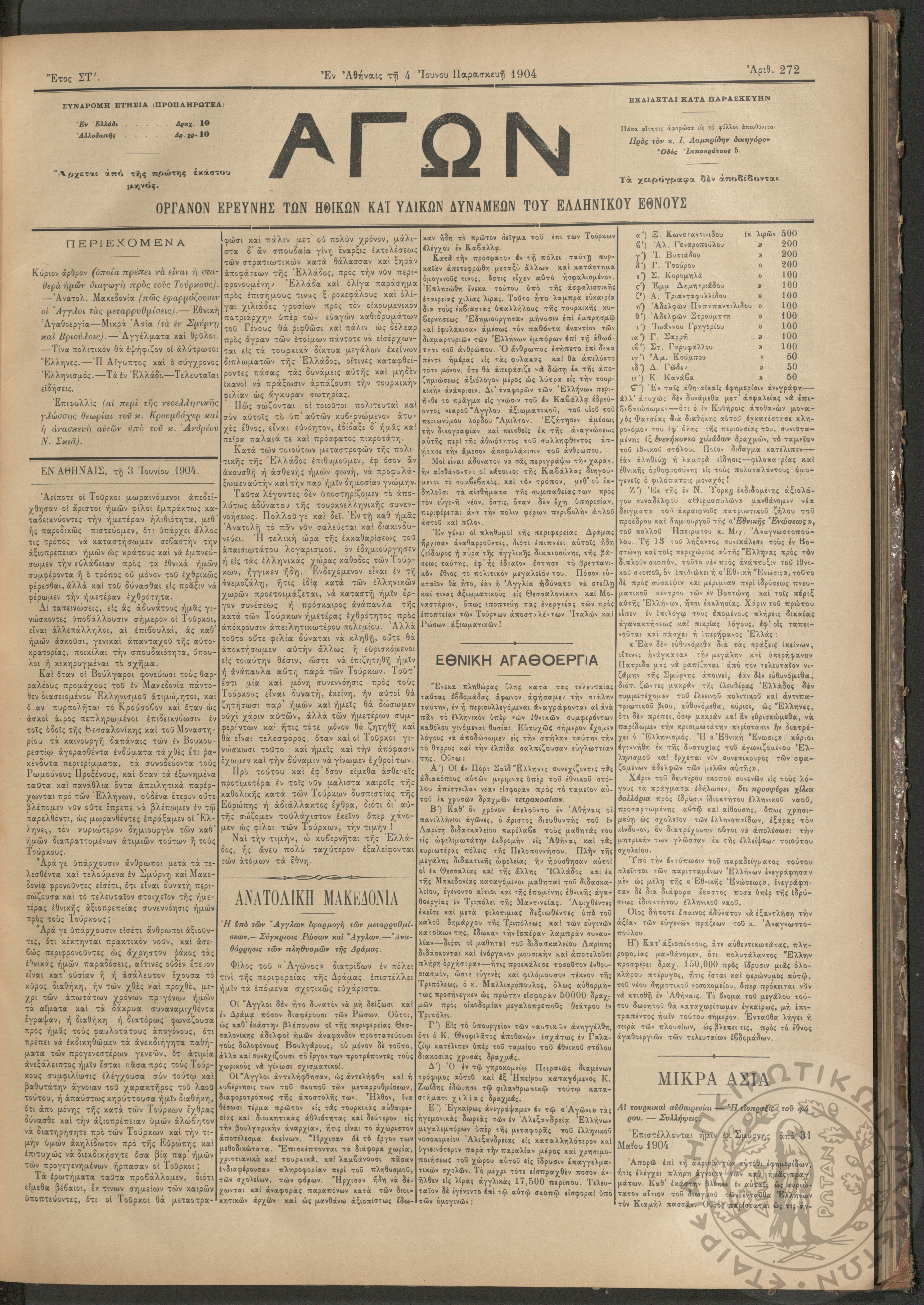 Αγών: Όργανον ερεύνης των ηθικών και υλικών δυνάμεων του Ελληνικού Έθνους, 1904 (Φ. 272)Έτος ΣΤ΄, Φ. 272...