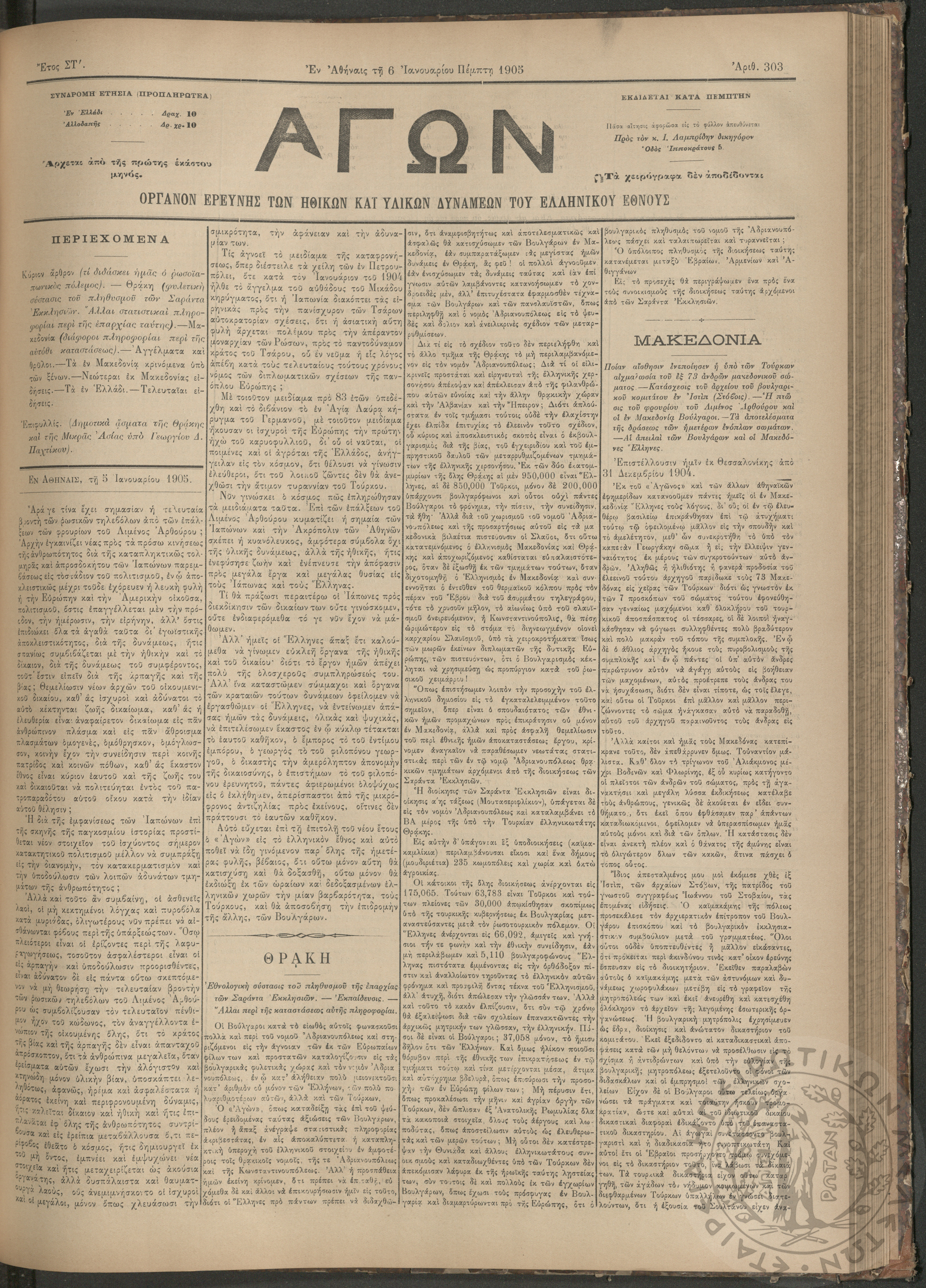 Αγών: Όργανον ερεύνης των ηθικών και υλικών δυνάμεων του Ελληνικού Έθνους, 1905 (Φ. 303)Έτος ΣΤ΄, Φ. 303...