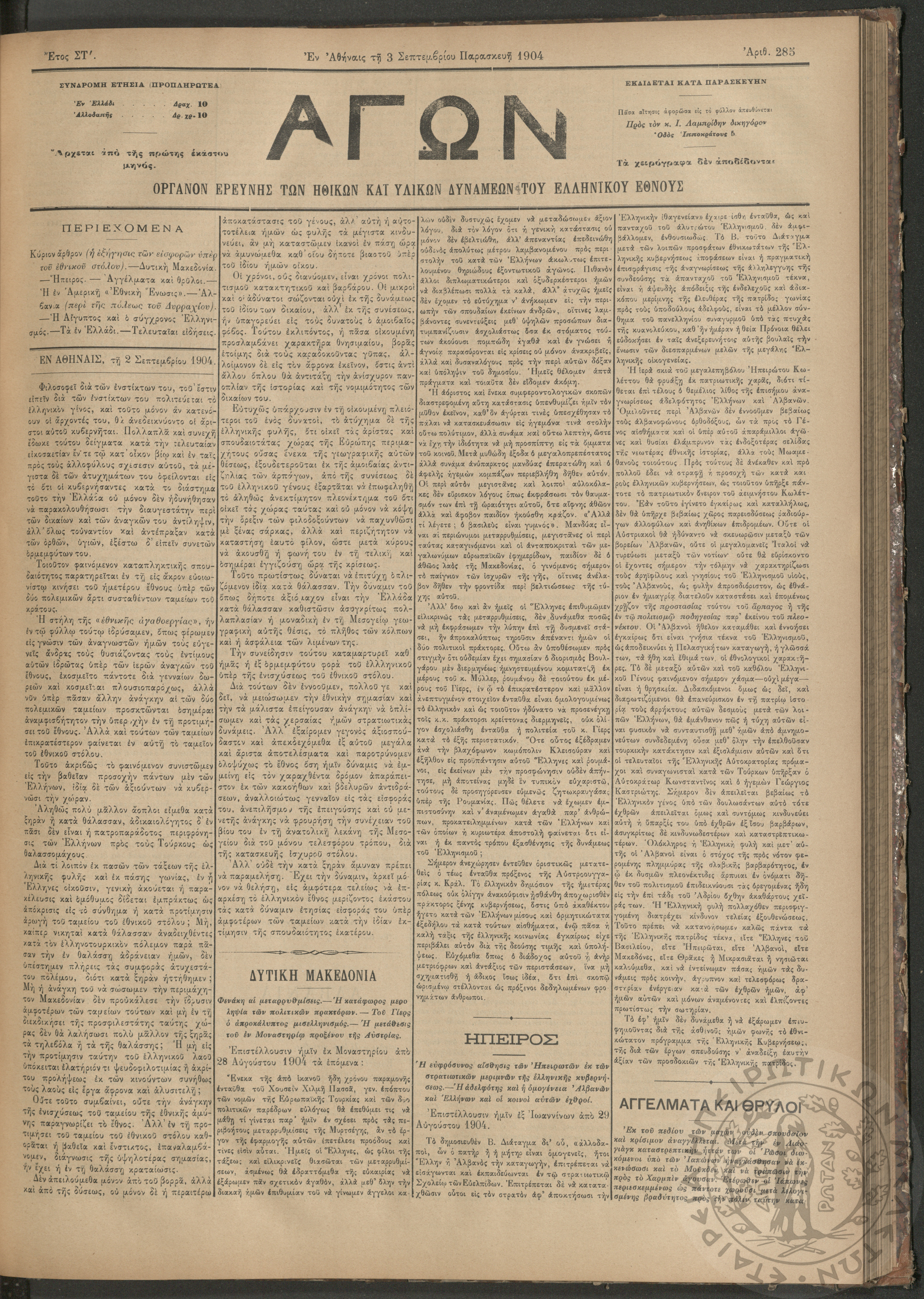 Αγών: Όργανον ερεύνης των ηθικών και υλικών δυνάμεων του Ελληνικού Έθνους, 1904 (Φ. 285)Έτος ΣΤ΄, Φ. 285...